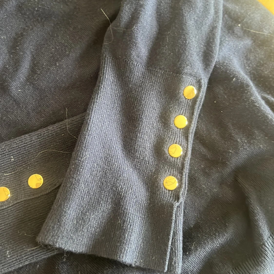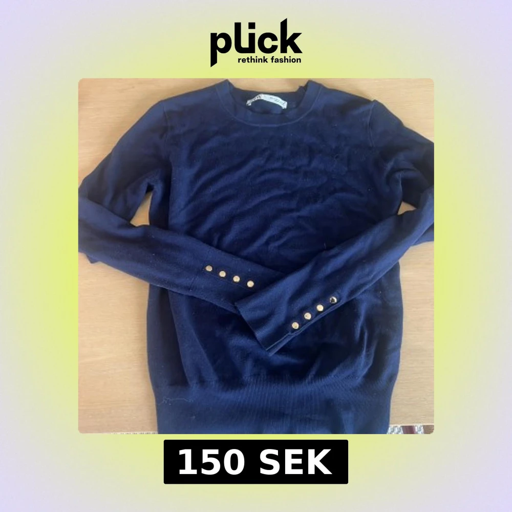 Supersnygg mörkblå stickad tröja från Zara med rund hals och långa ärmar. Ärmsluten är dekorerade med fem guldiga knappar som ger en lyxig touch. Perfekt till jeans eller kjol för en stilren look. #stockholmstil