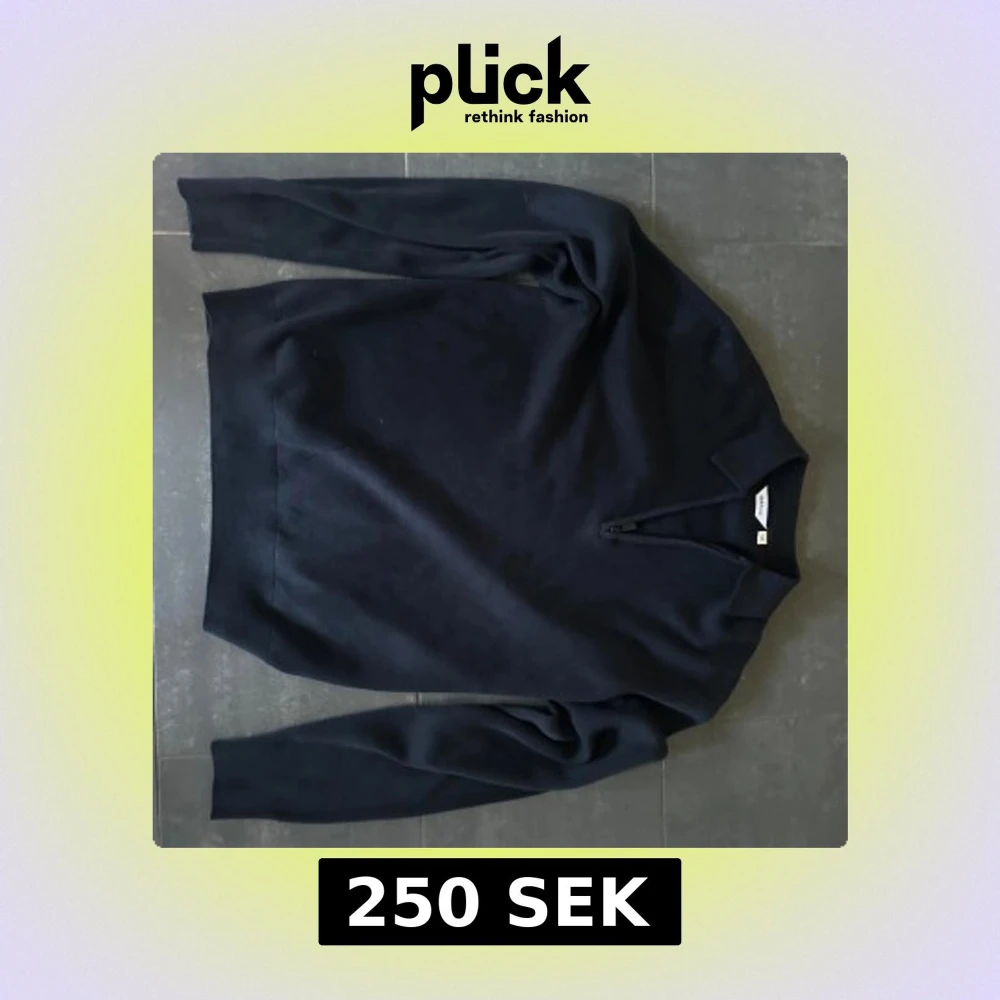 Mörkblå stickad tröja från dobber i storlek M. Tröjan har en klassisk krage och en snygg half zip-dragkedja framtill. Perfekt för lager-på-lager och passar till både jeans och chinos. Långärmad och mjuk i materialet. Aldrig använd. Ny pris 750kr