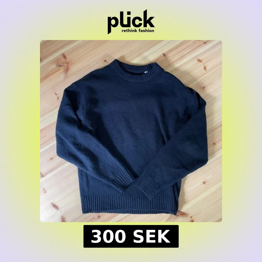 En enkel och stilren mörkblå stickad tröja med rund halsringning och långa ärmar. Tröjan har ribbade muddar vid ärmslut.