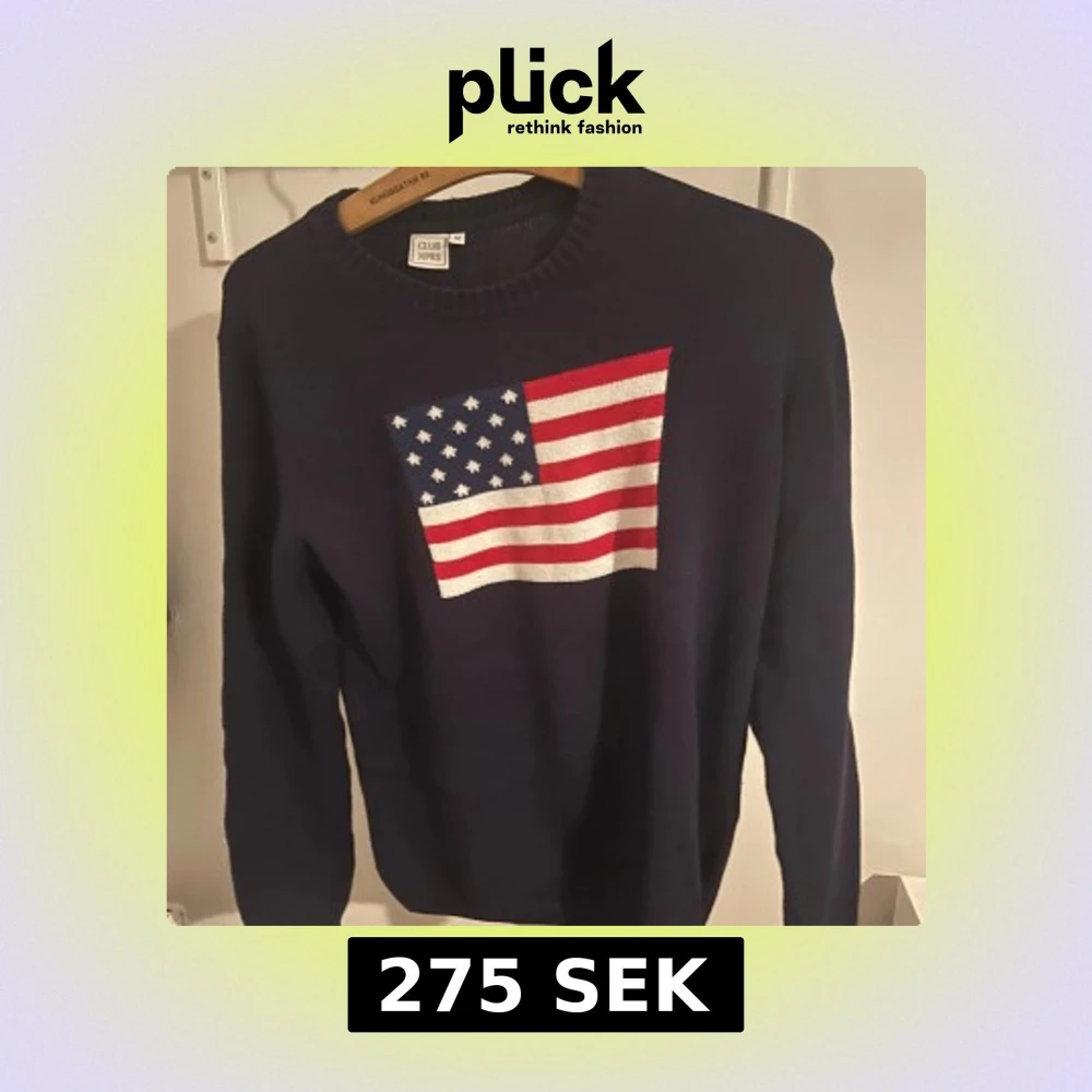 Snygg mörkblå stickad tröja från Club XPRS i storlek M. På bröstet finns en stor USA-flagga i rött, vitt och blått. Tröjan har rund hals och långa ärmar, Hör av er vid frågor priset är diskuterbart.