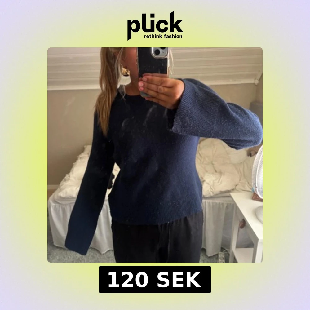 Mysig mörkblå stickad tröja med rund halsringning och långa, lite vidare ärmar. Enkel och stilren modell som passar perfekt till jeans eller mjukisbyxor. Skön att bära under kyligare dagar och lätt att matcha med olika outfits.