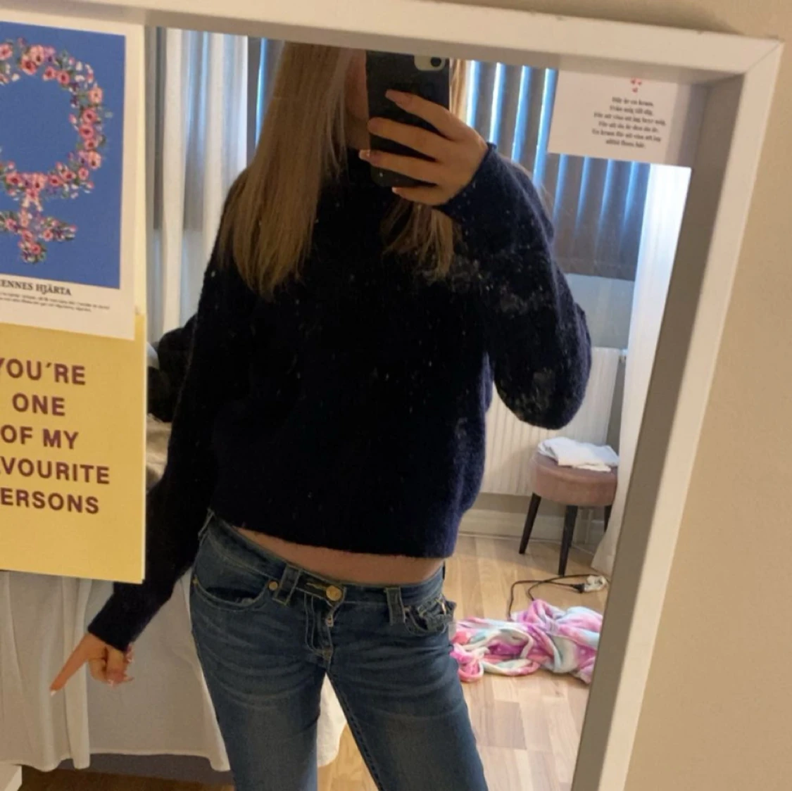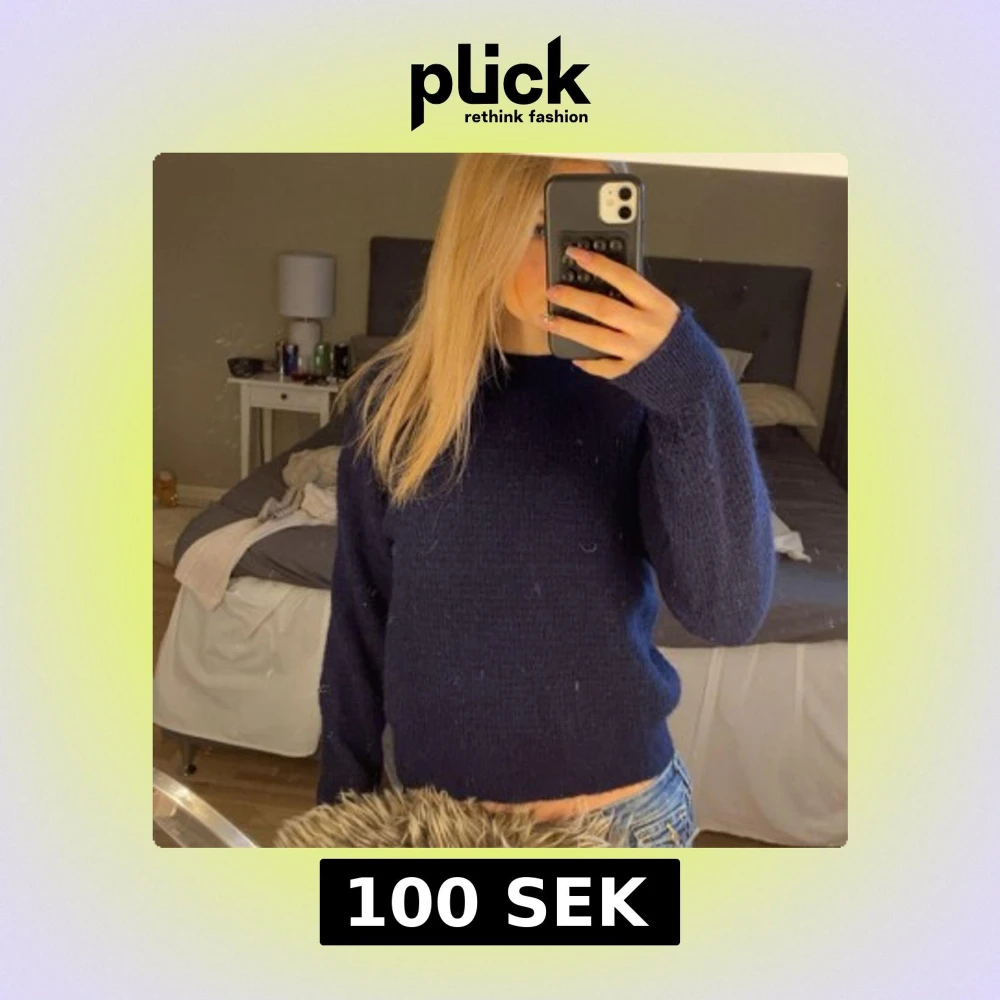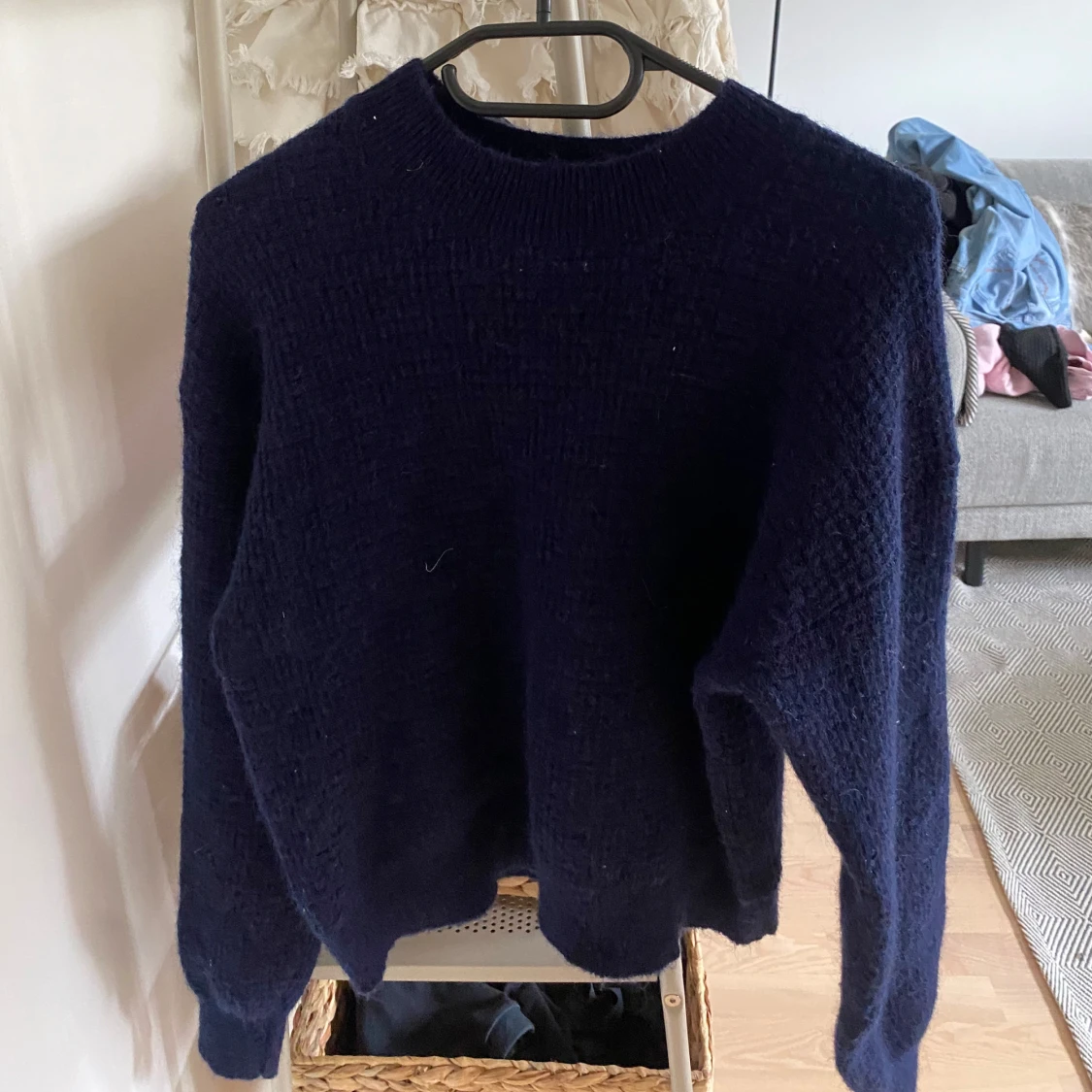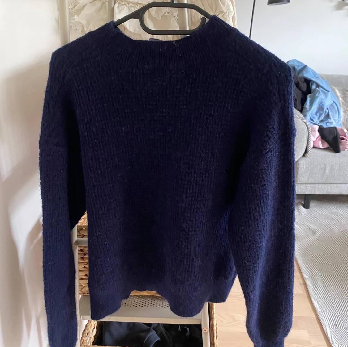 Mysig mörkblå stickad tröja med rund halsringning och långa ärmar. Tröjan är perfekt att matcha med jeans eller kjol. Passformen är normal och materialet känns mjukt och bekvämt.