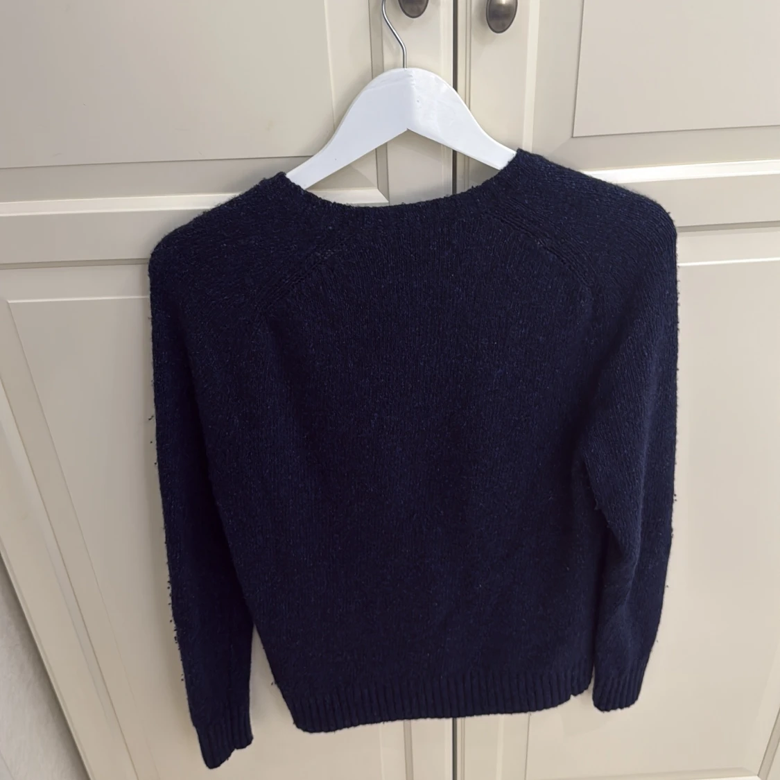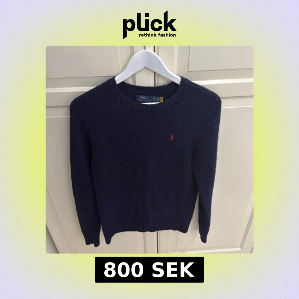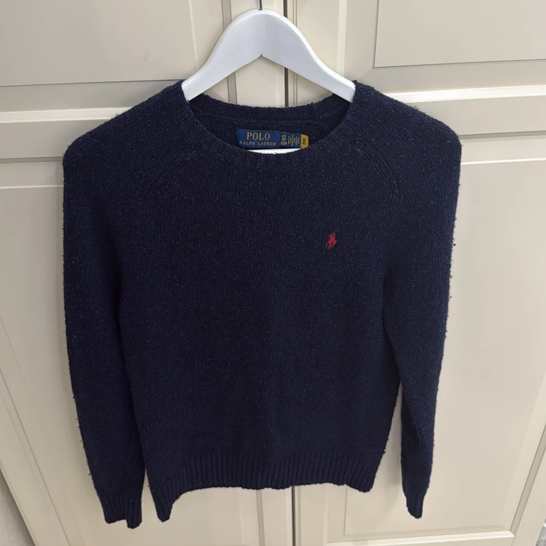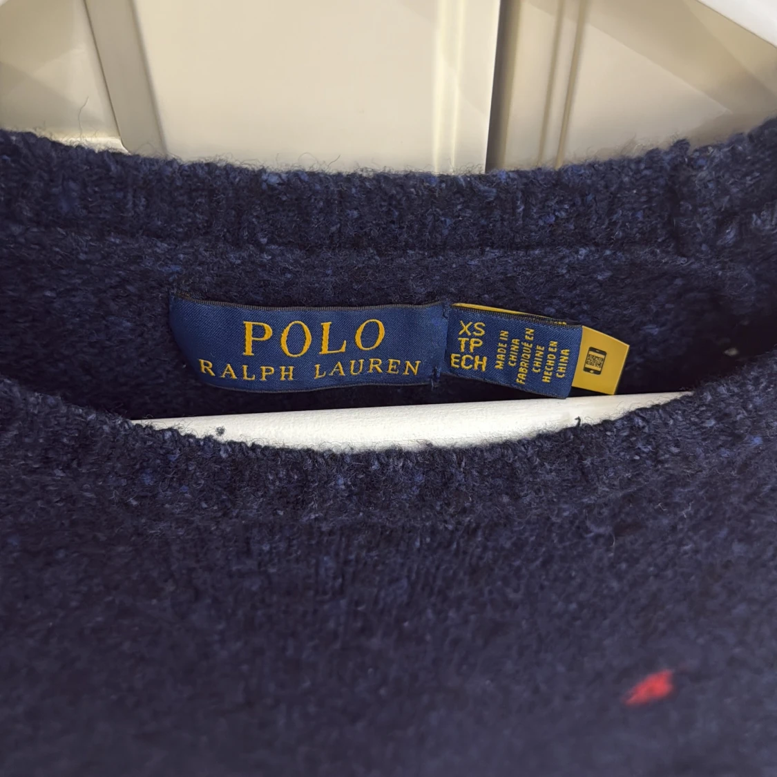 Mysig mörkblå stickad tröja från Polo Ralph Lauren i storlek XS. Klassisk modell med rund halsringning, ribbade muddar och diskret röd logga broderad på bröstet. Perfekt för lager-på-lager och chill stil.