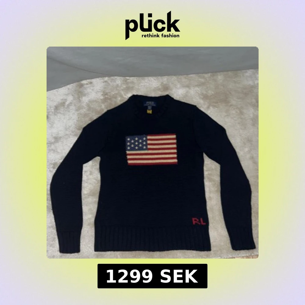 Mörkblå stickad tröja från Polo Ralph Lauren med amerikansk flagga framtill och RL-broderi i rött nedtill. Perfekt för dig som gillar grisch stil. Har aldrig använts pga fel storlek och pris kan diskuteras!