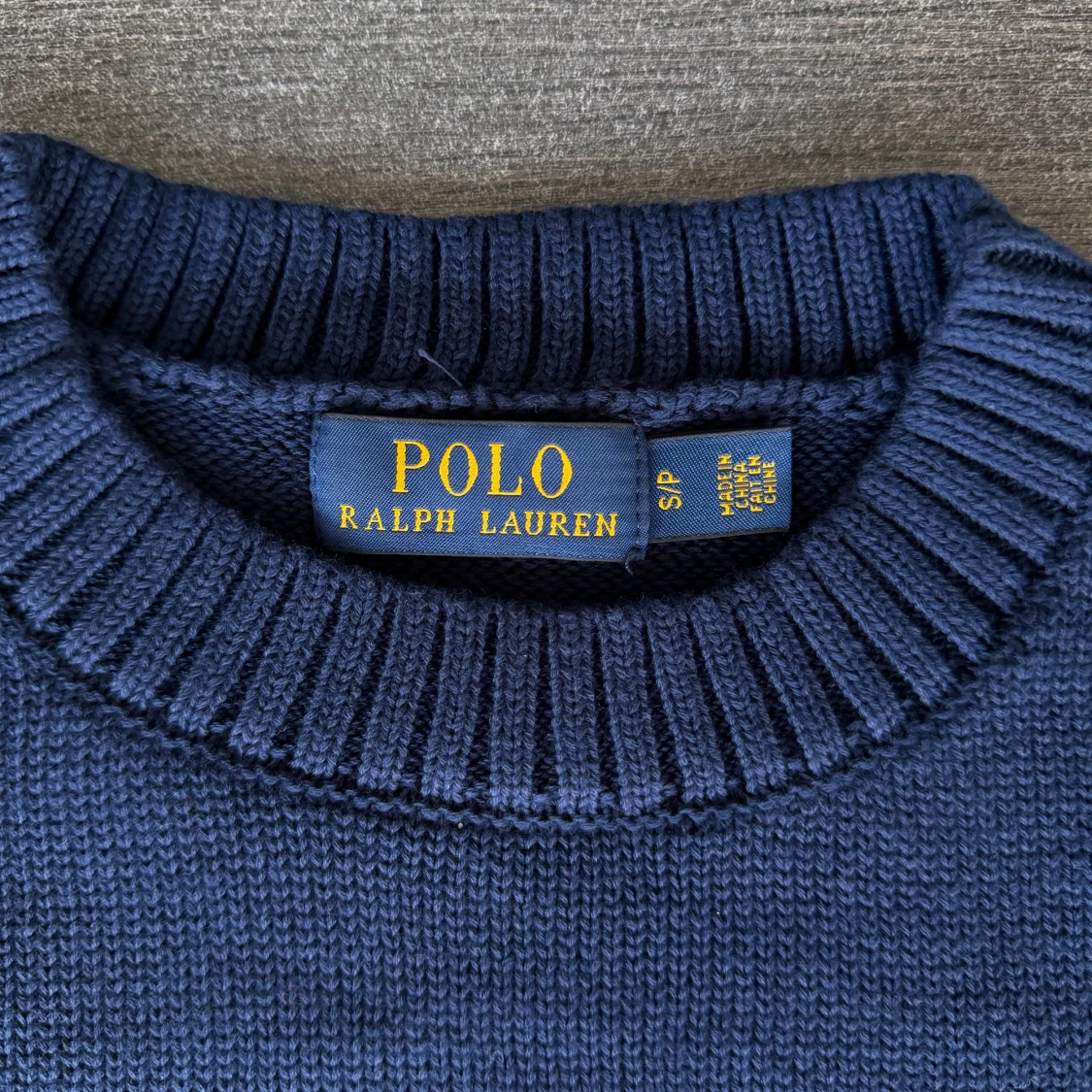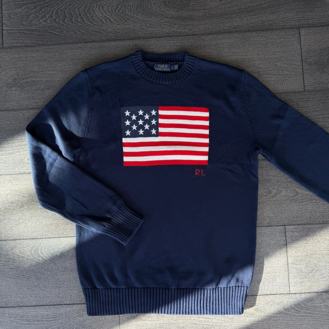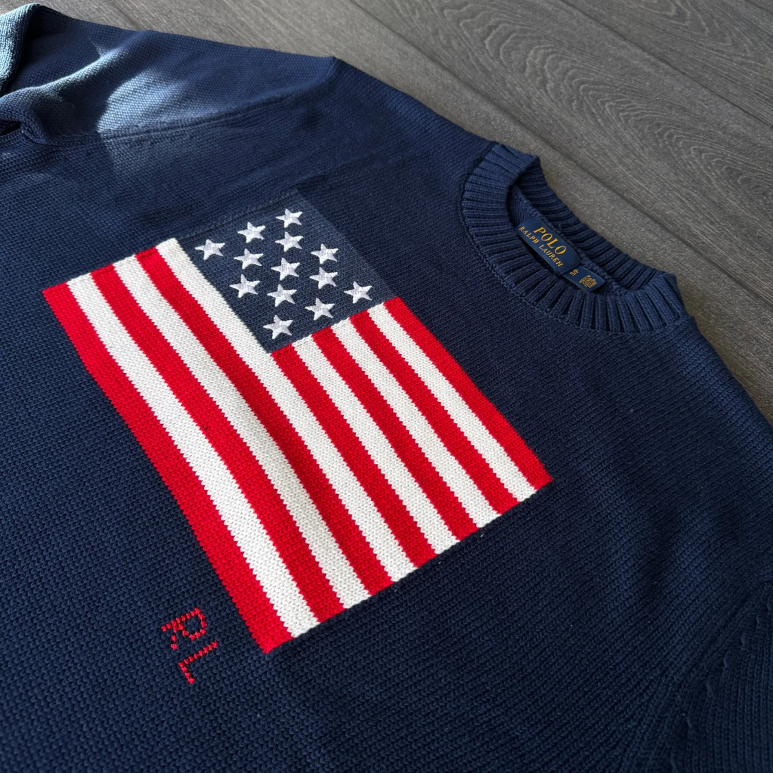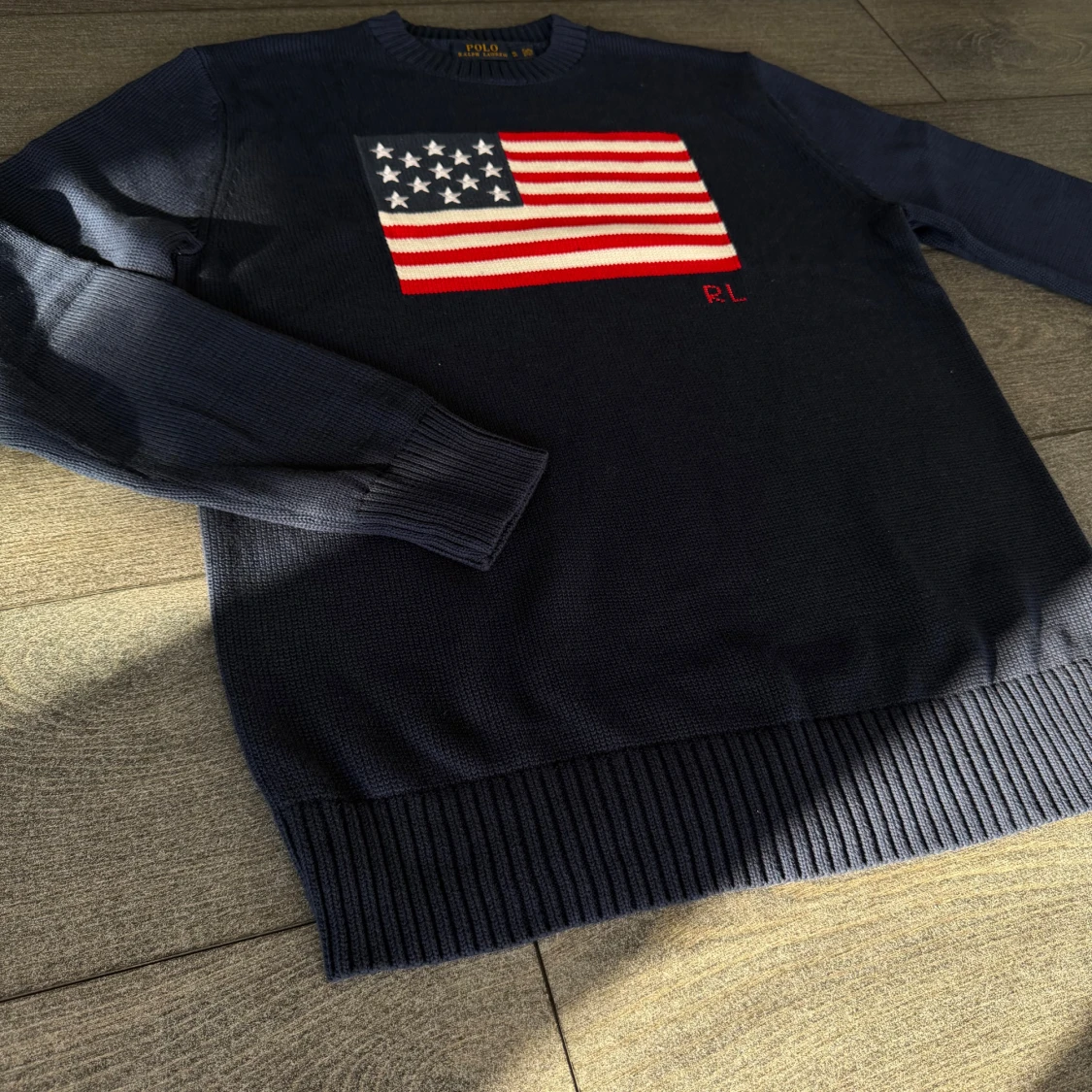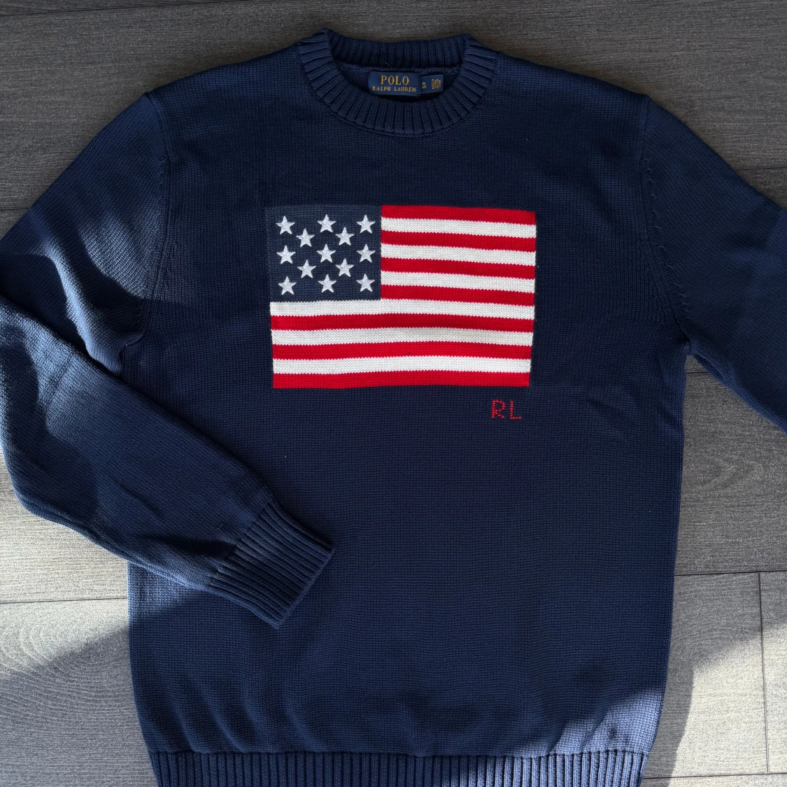 Mörkblå stickad tröja från Polo Ralph Lauren med stor amerikansk flagga på bröstet och RL-broderi. Klassisk rund halsringning och ribbade muddar. Perfekt för dig som vill sticka ut med en ikonisk look.