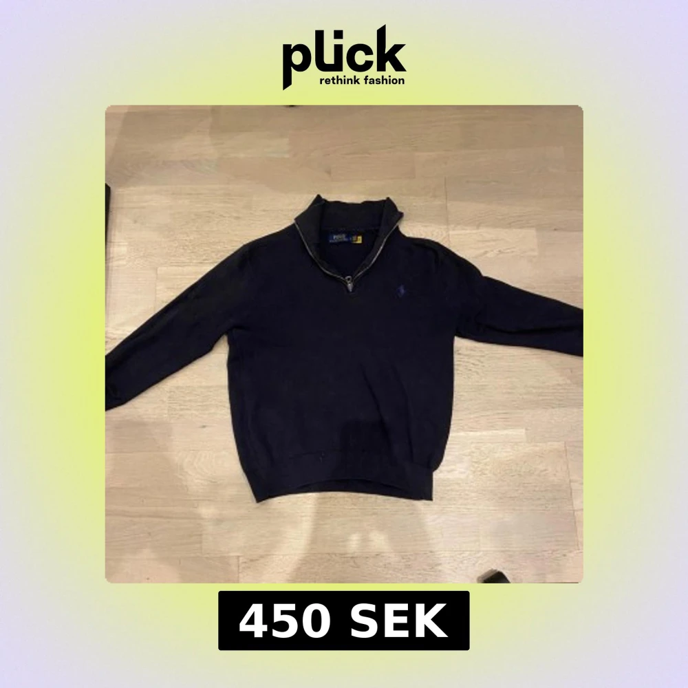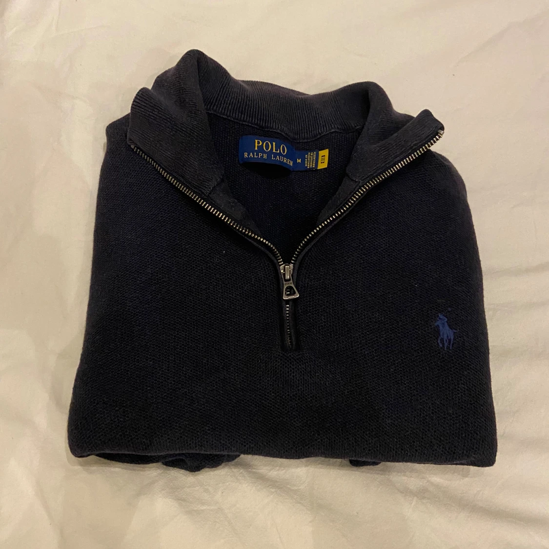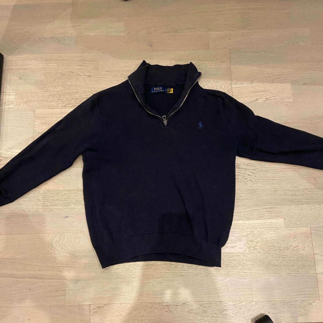 Mörkblå stickad tröja från Polo Ralph Lauren med halv dragkedja och klassisk broderad logga på bröstet. Tröjan har lång ärm och hög krage, perfekt för kyligare dagar. Snygg och tidlös modell som funkar till det mesta. Tröjan är i storlek M men passar även S.