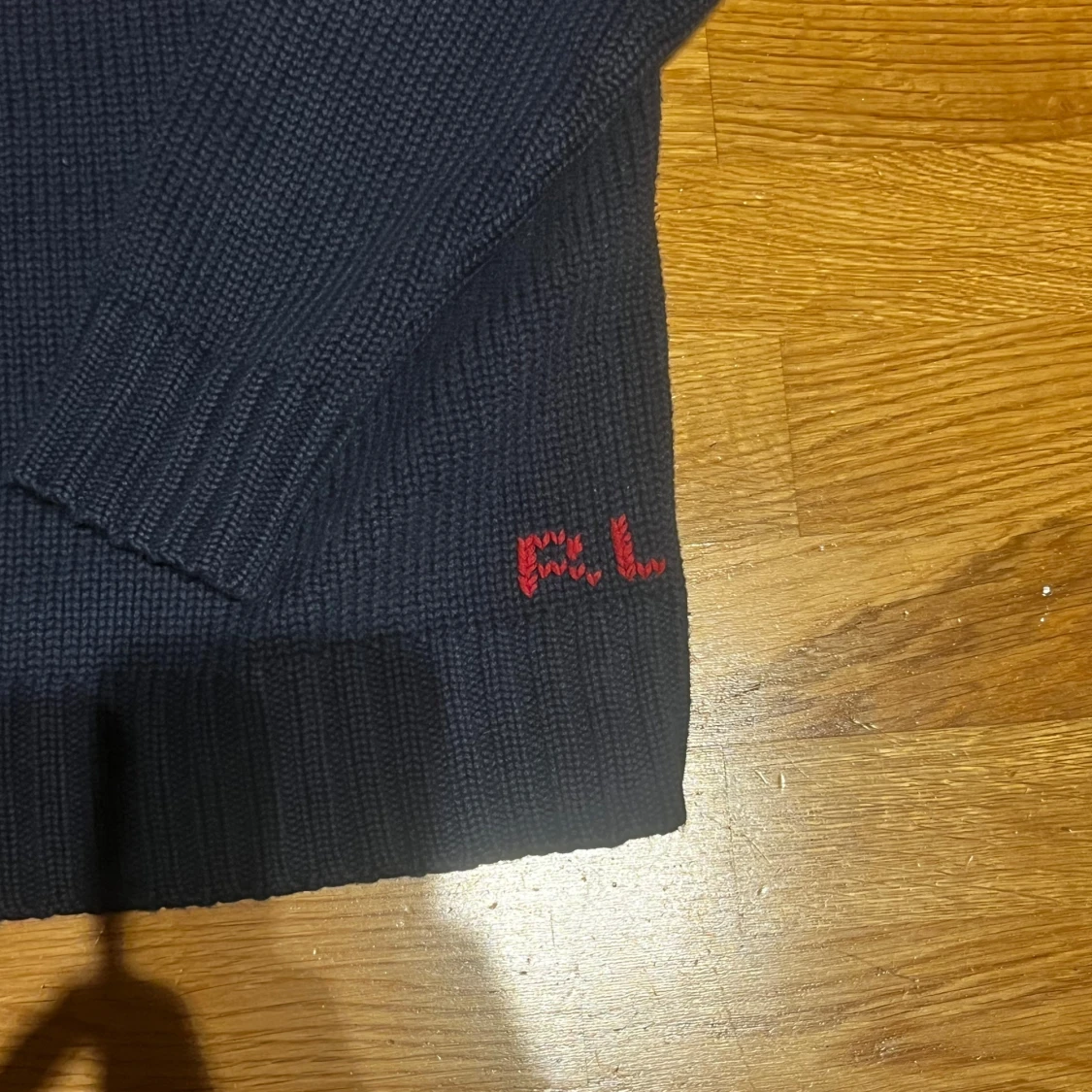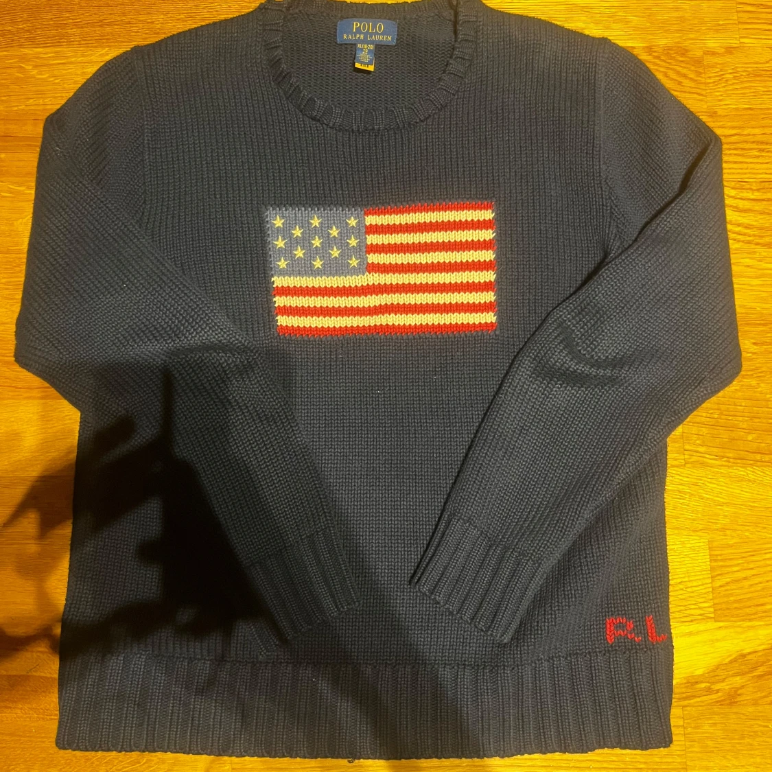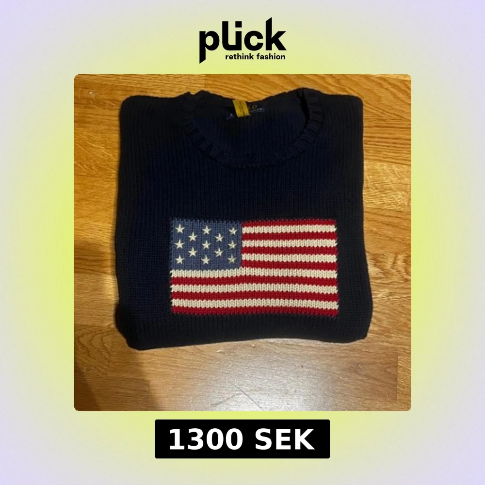Snygg mörkblå stickad tröja från Polo Ralph Lauren i storlek XL Junior. Framtill finns en stor amerikansk flagga i rött, vitt och blått, samt RL-broderi i rött vid nederkanten. Tröjan har rund hals och långa ärmar, perfekt för dig som gillar klassisk preppy stil.