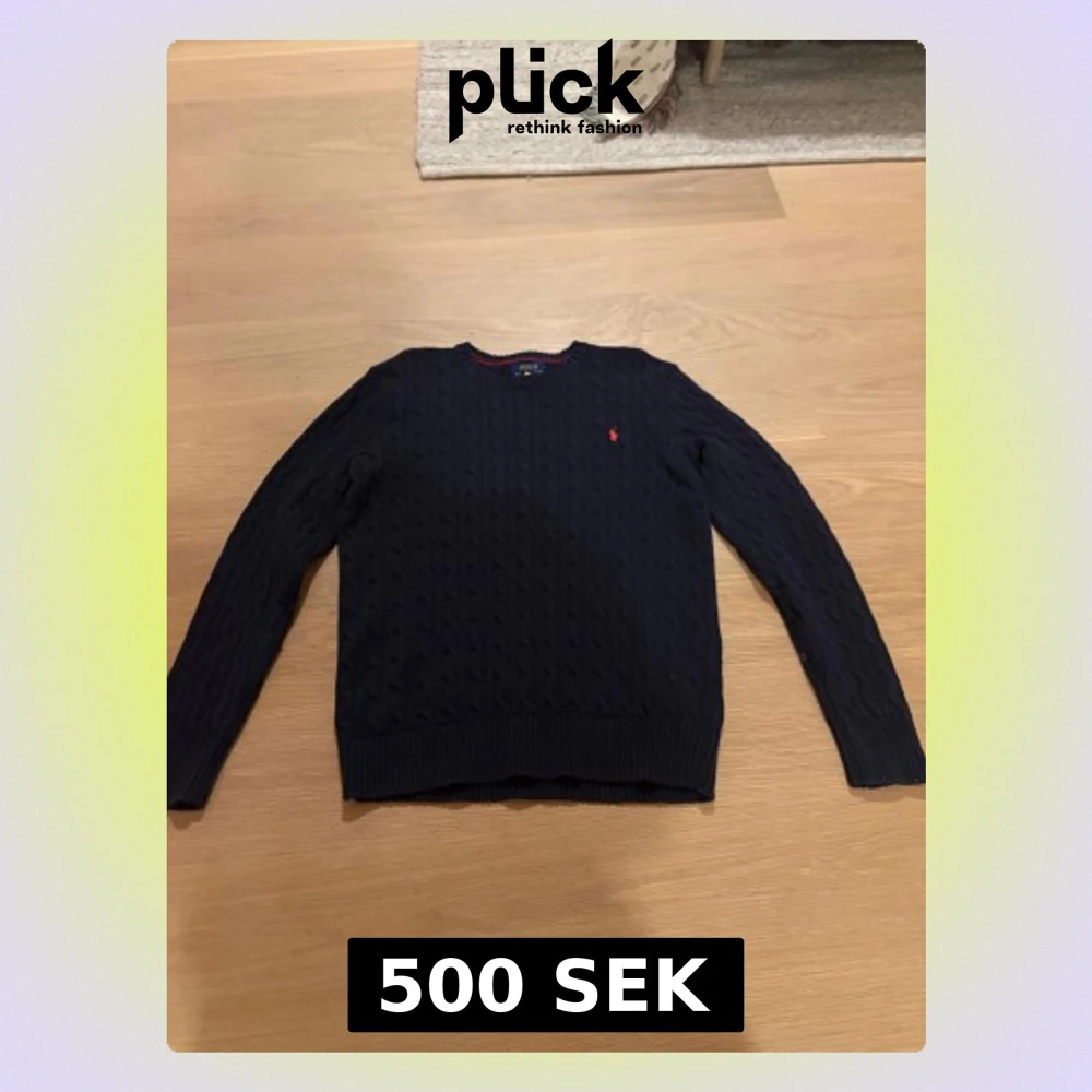 Snygg mörkblå stickad tröja från Polo Ralph Lauren i storlek XL. Tröjan har klassiskt kabelstickat mönster, rund hals och en röd broderad logga på bröstet. Perfekt för dig som gillar stilrena och tidlösa plagg med premiumkänsla.