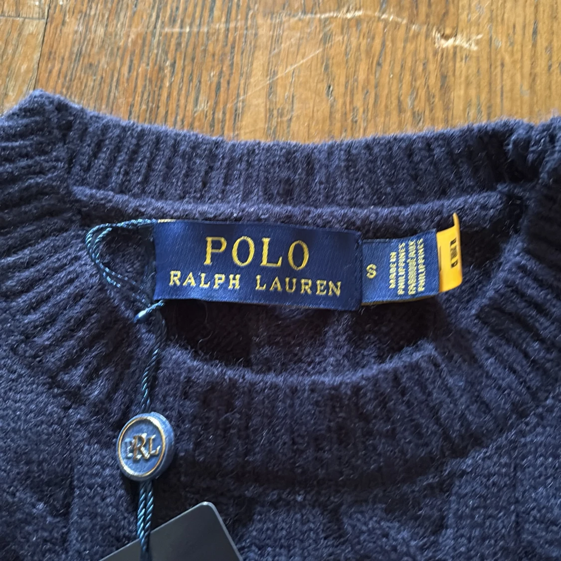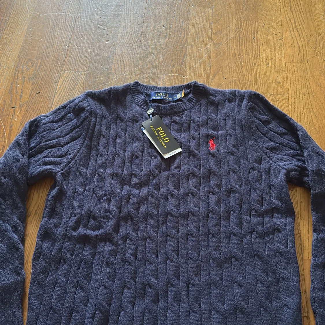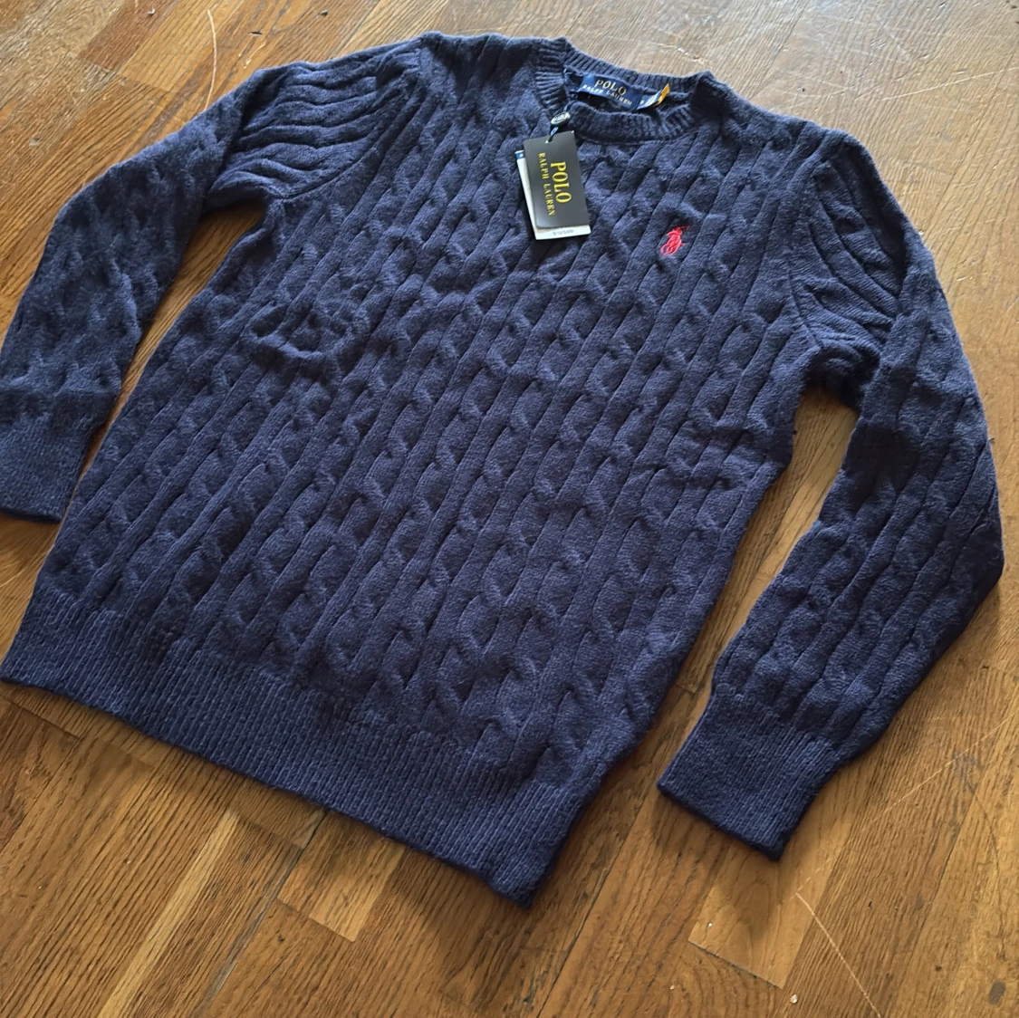 Snygg mörkblå stickad tröja från Polo Ralph Lauren med klassiskt kabelstickat mönster och röd broderad logga på bröstet. Rund hals och långa ärmar, perfekt för dig som gillar stilrena och tidlösa plagg. Passar dig som vill ha en chill men ändå preppy look.