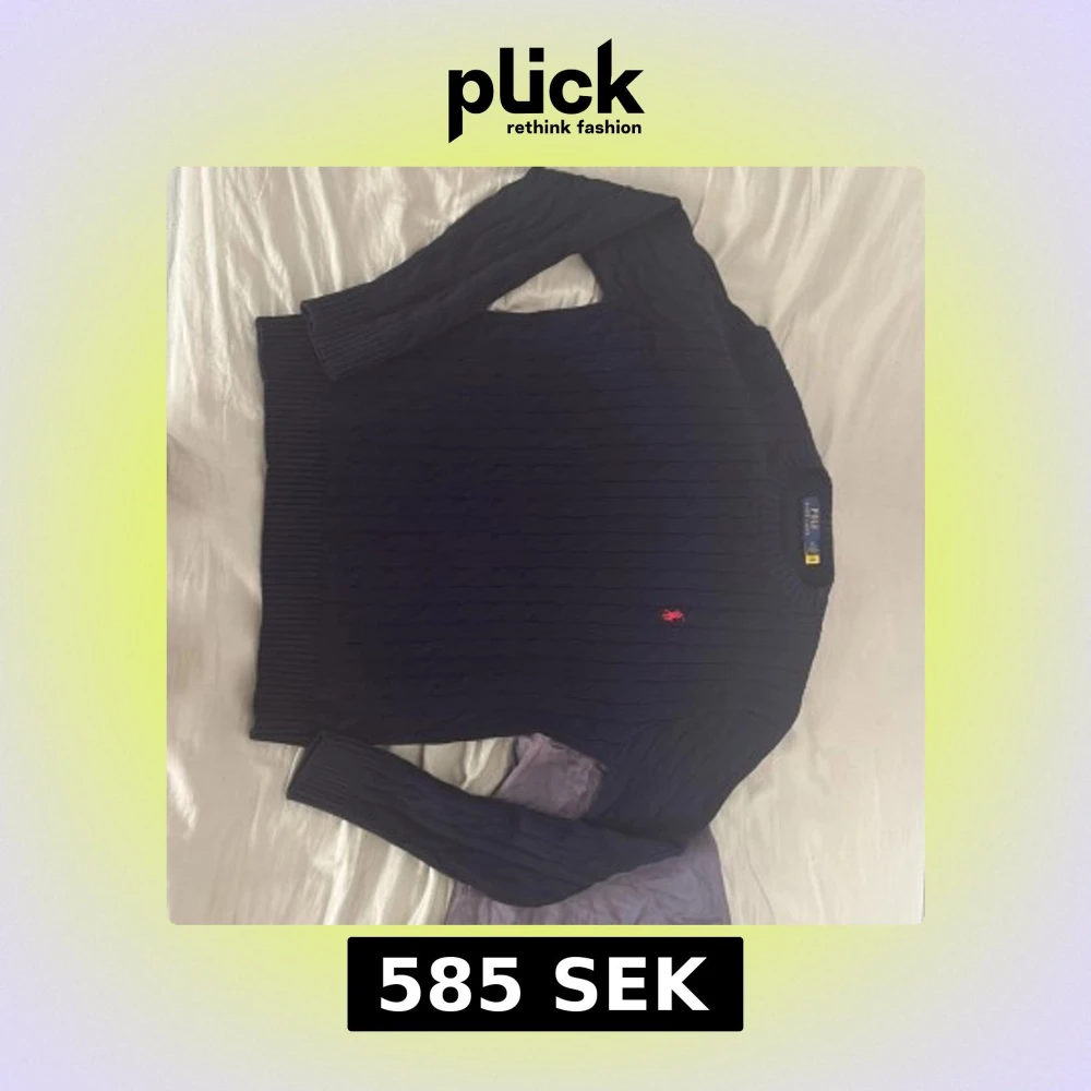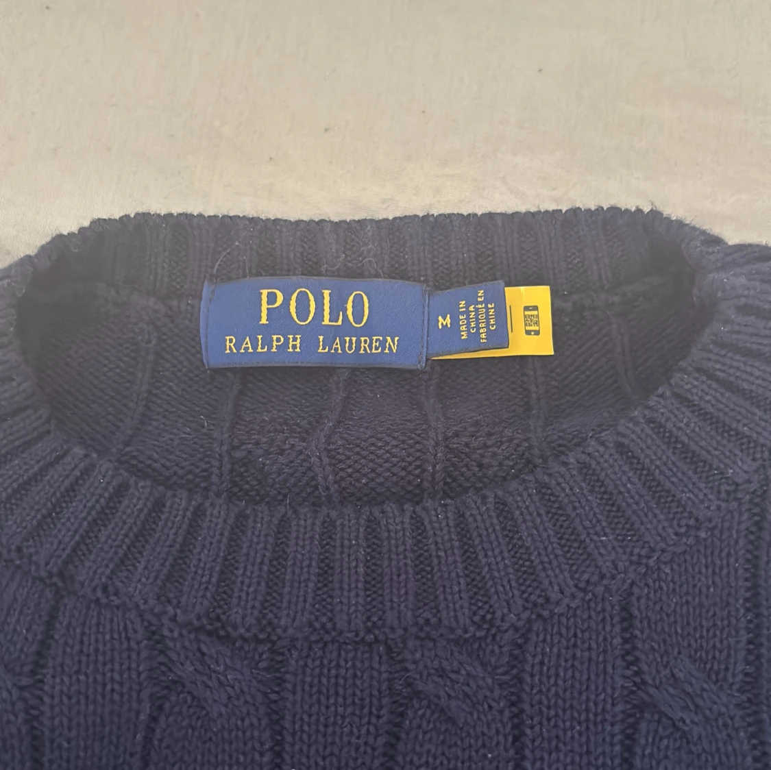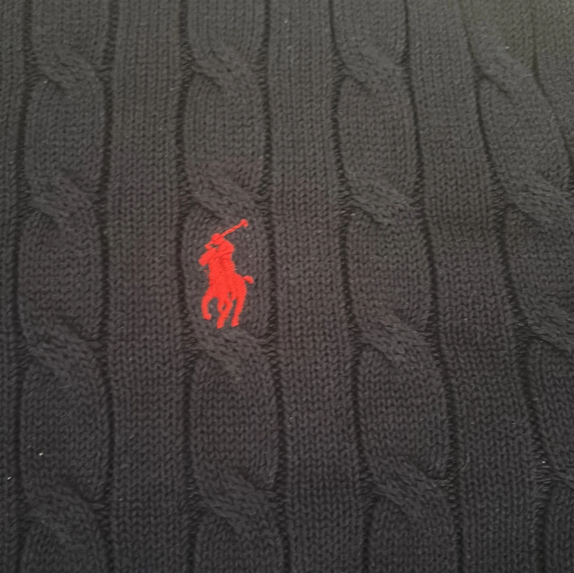 Säljer en mörkblå kabelstickad tröja från Polo Ralph Lauren med klassisk röd broderad logga på bröstet. Tröjan har rund halsringning, långa ärmar och är tillverkad i mjuk bomull. Perfekt för dig som gillar stilren och tidlös design.