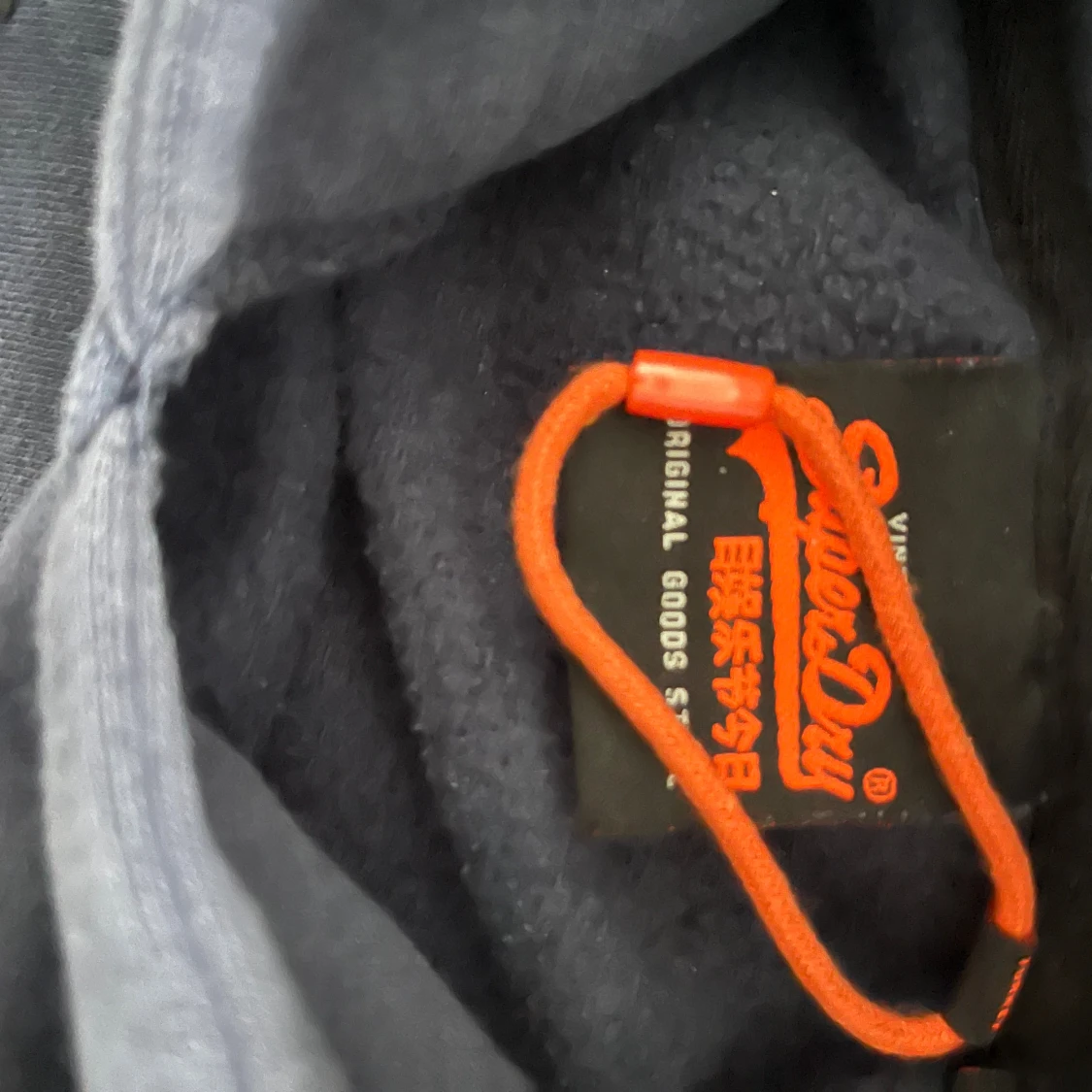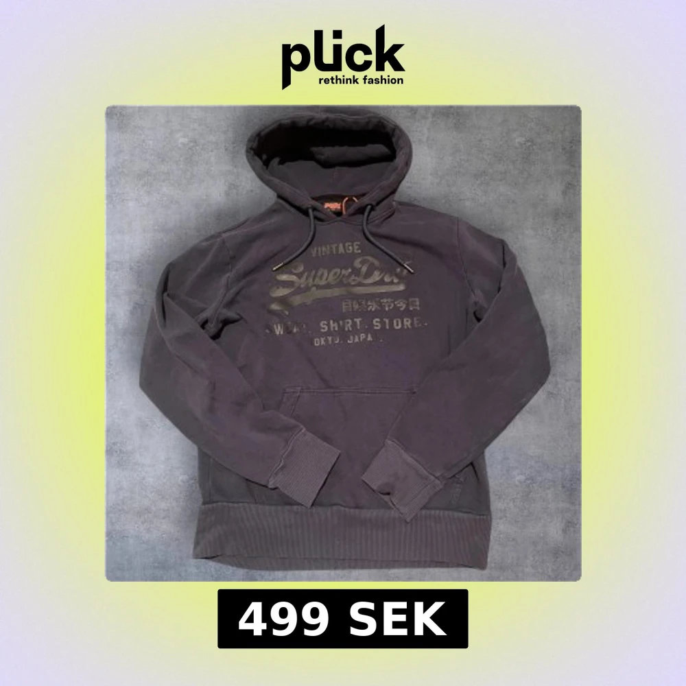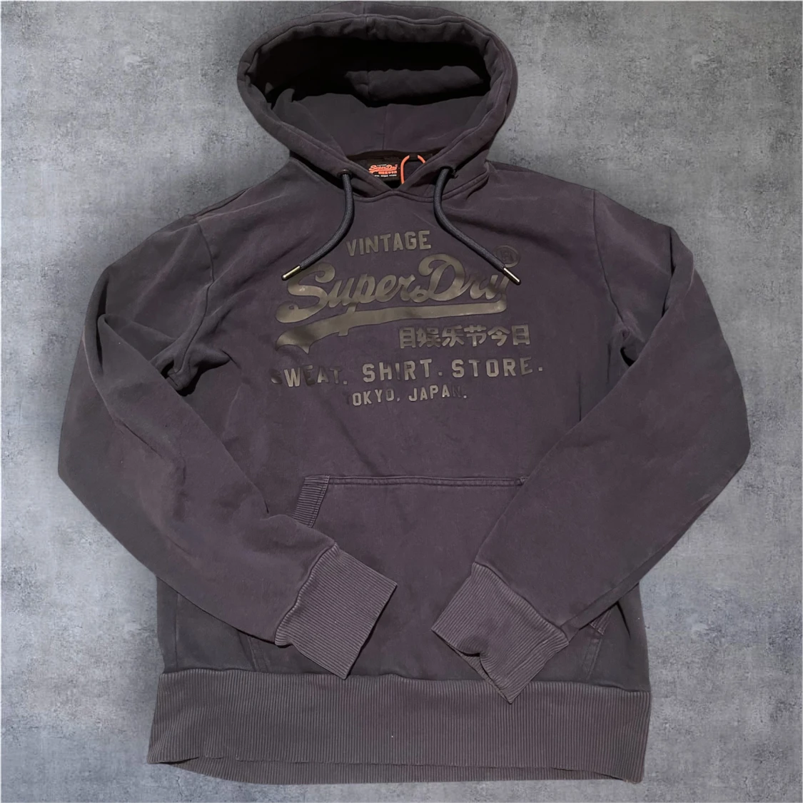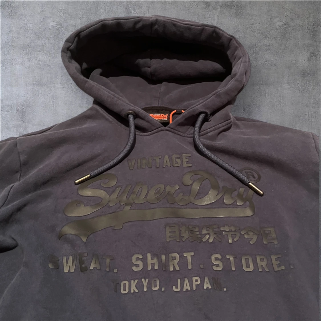 Säljer en mörkgrå hoodie från Superdry med stort tryck på bröstet och japanska tecken. Tröjan har huva med snörning, ribbade muddar och en klassisk känguruficka framtill. Perfekt för dig som gillar streetwear och vill ha en chill look.