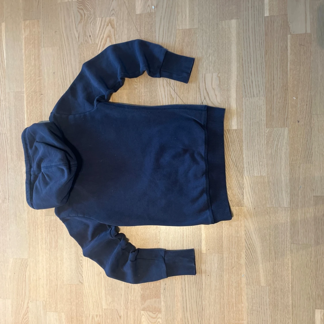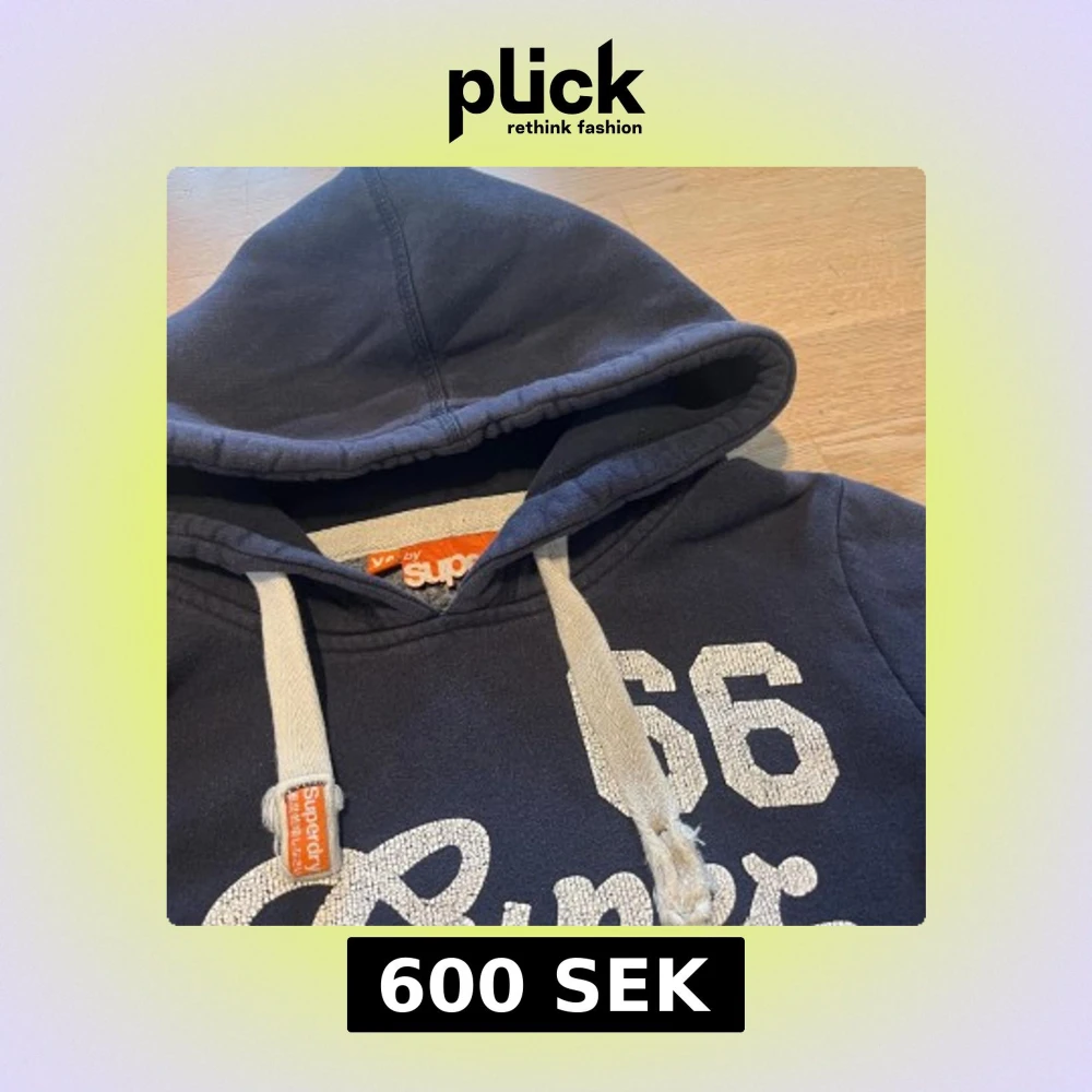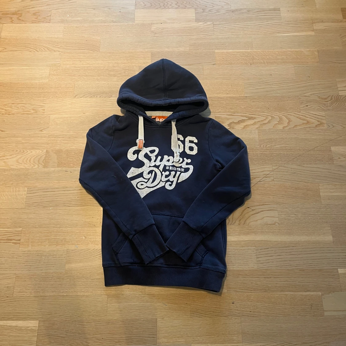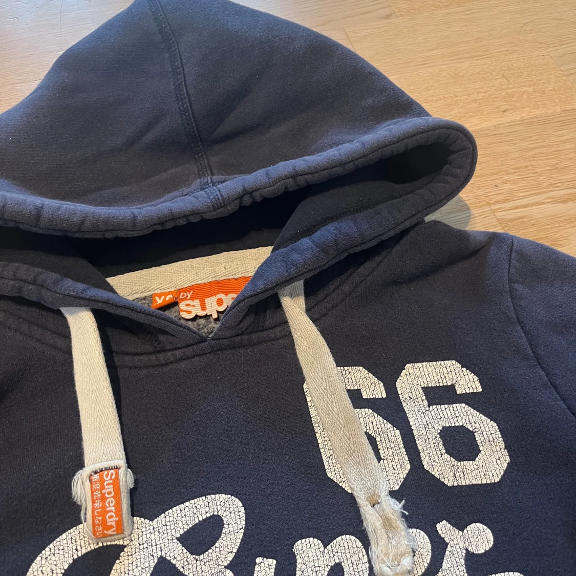Snygg mörkblå hoodie från Superdry med stort vitt tryck på bröstet och siffran 66. Tröjan har huva med grova snören och ribbade muddar vid ärmar och nederkant. Perfekt för chill dagar. Passar lite under 170