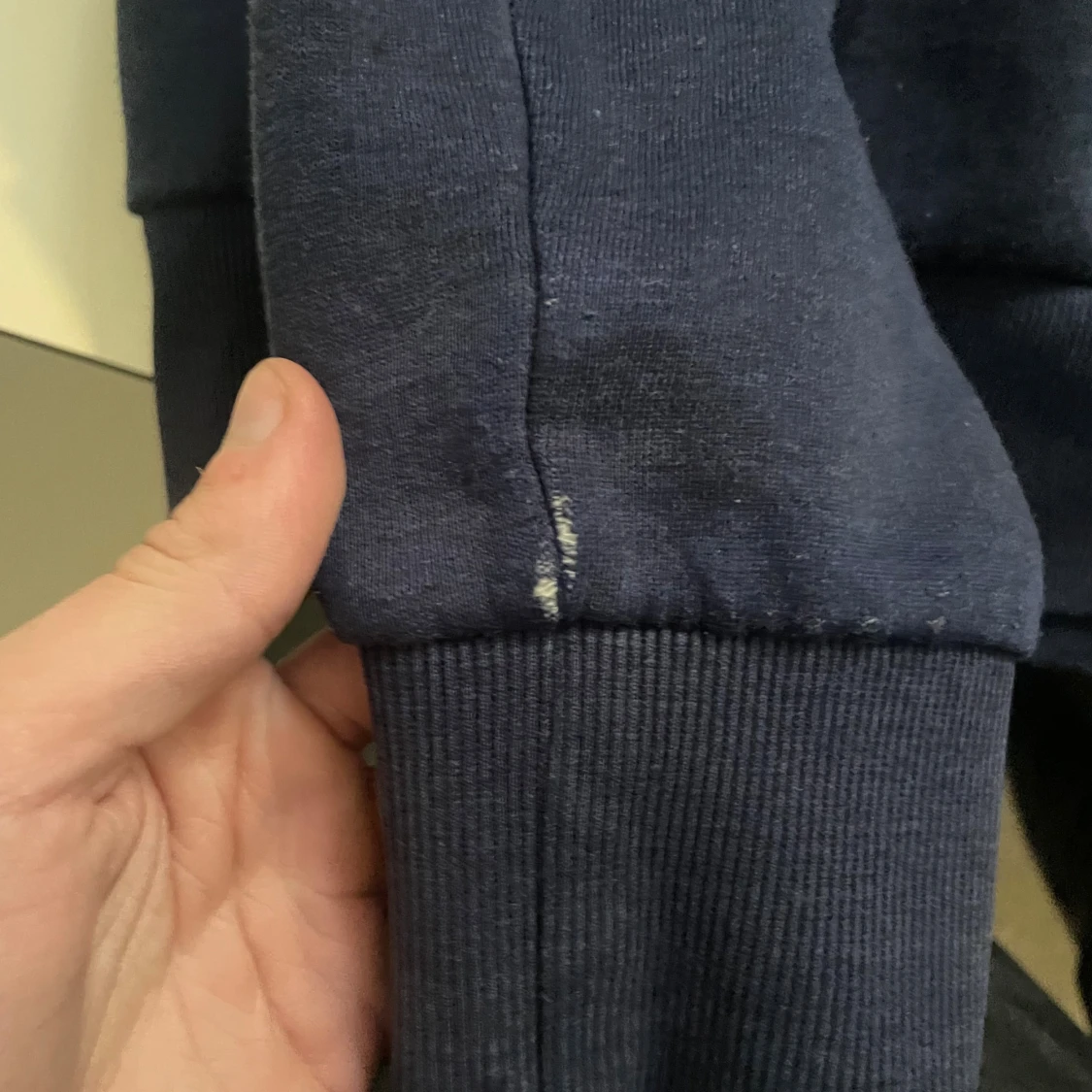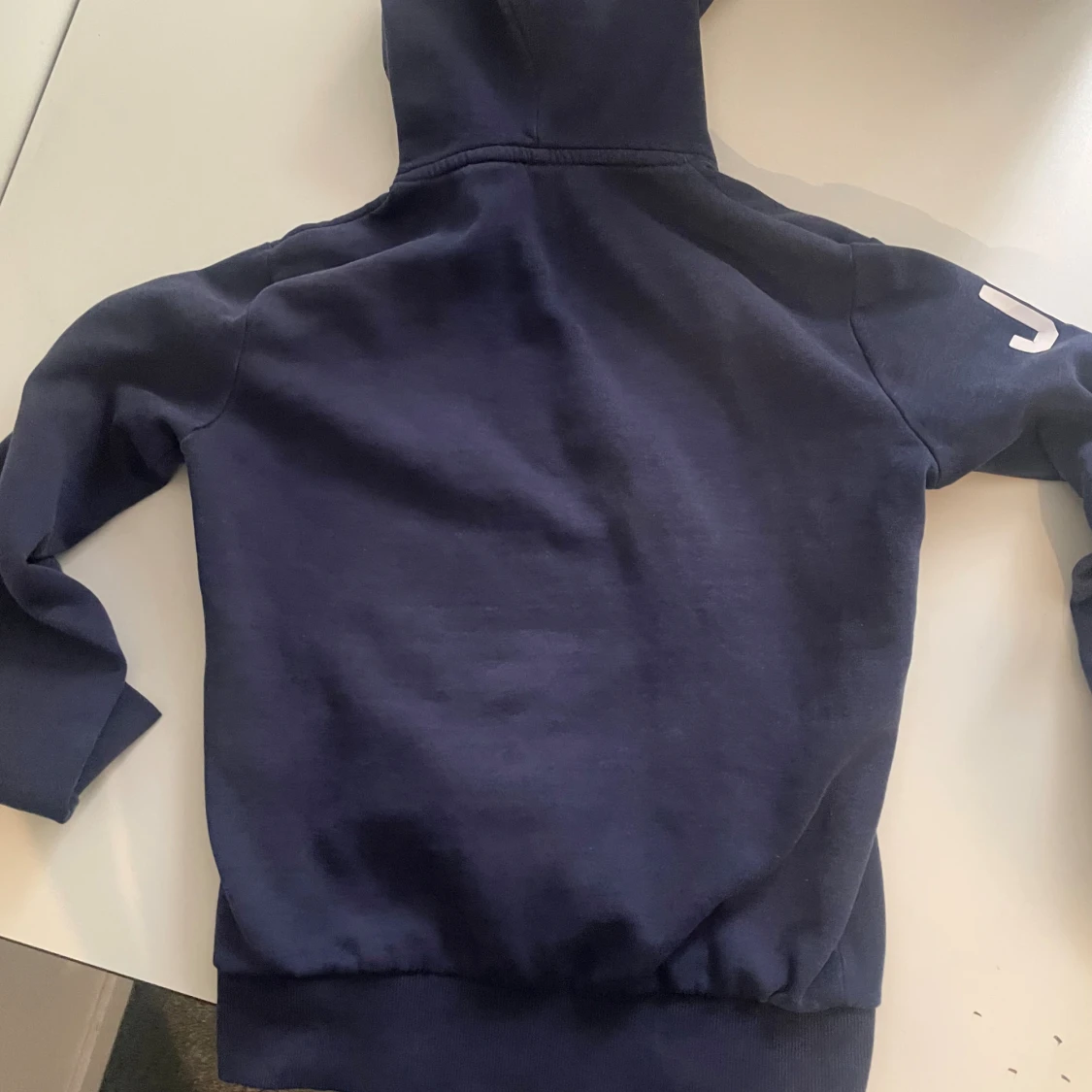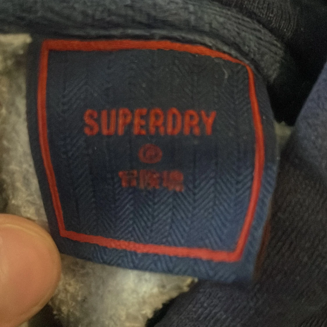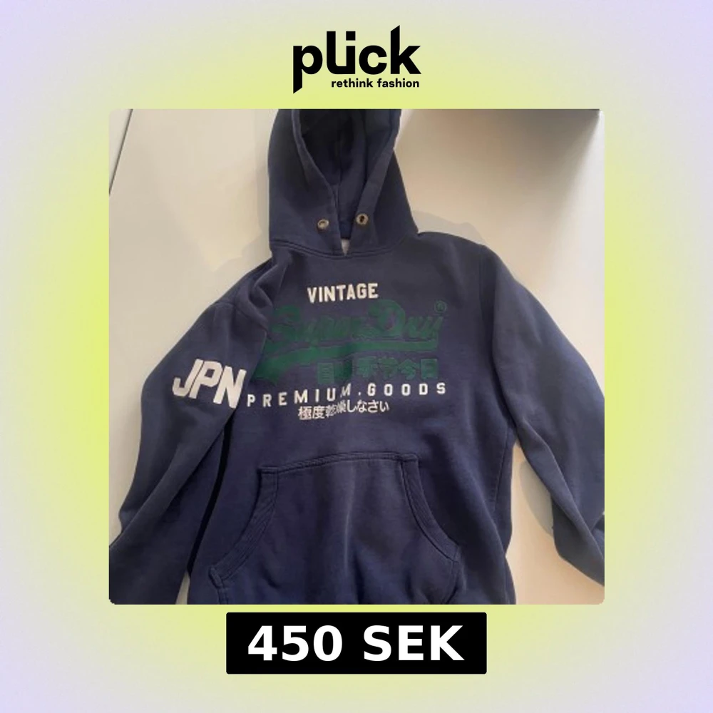 Säljer en mörkblå hoodie från Superdry med grönt och vitt tryck på bröstet och ärmen. Tröjan har huva med snörning, känguruficka och ribbade muddar. Perfekt för chill dagar och streetstyle. Materialet är mjuk bomull och polyesterblandning. Priset är ej hugget i sten.
