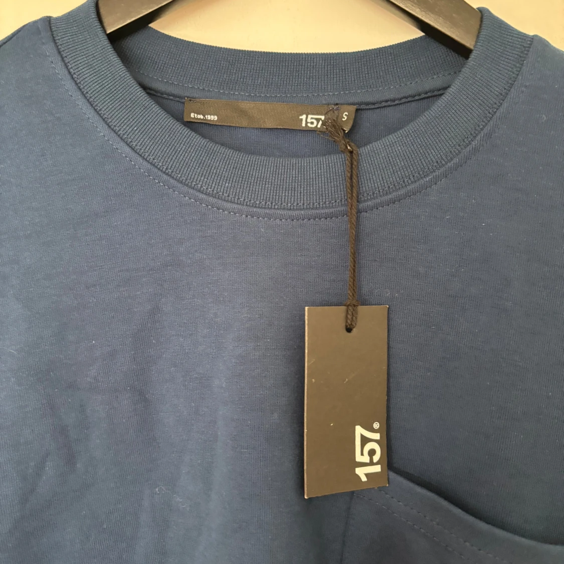En stilren mörkblå sweatshirt från 157 med rund halsringning och en bröstficka. Tröjan är i mjuk bomull och har långa ärmar med ribbade muddar. Perfekt för dig som gillar enkel och clean stil.