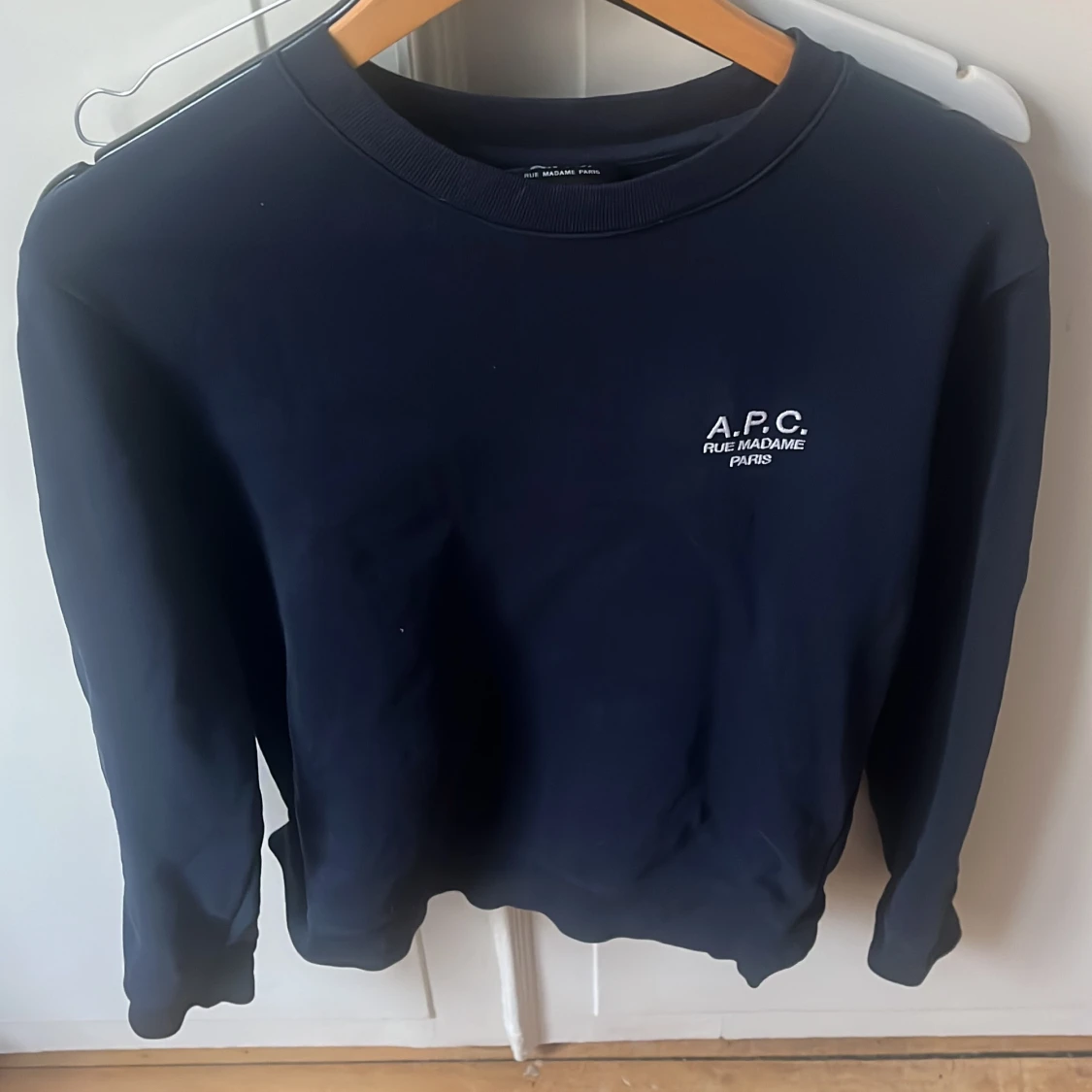 Snygg mörkblå sweatshirt från A.P.C. med vit broderad logga på bröstet. Klassisk rund halsringning och långa ärmar. Tillverkad i mjuk bomull, perfekt för en clean och stilren look.