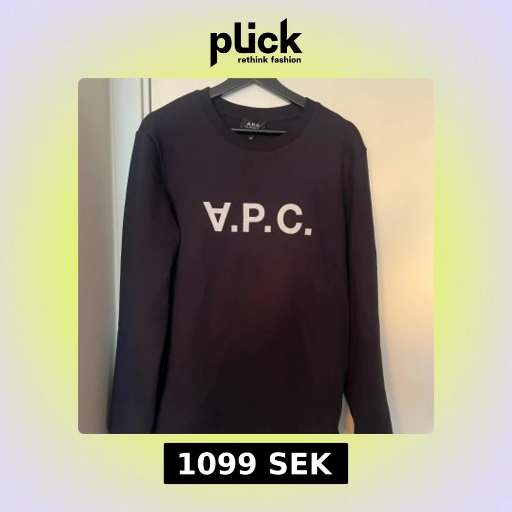 Säljer en stilren mörkblå sweatshirt från A.P.C. med vit logotyp på bröstet. Tröjan är helt NY!!! Tröjan har långa ärmar och en klassisk rund halsringning. Perfekt för en avslappnad look. Hör av dig vid fråga.