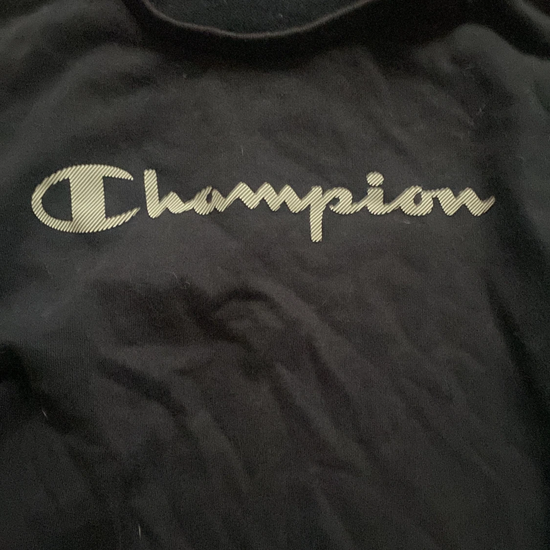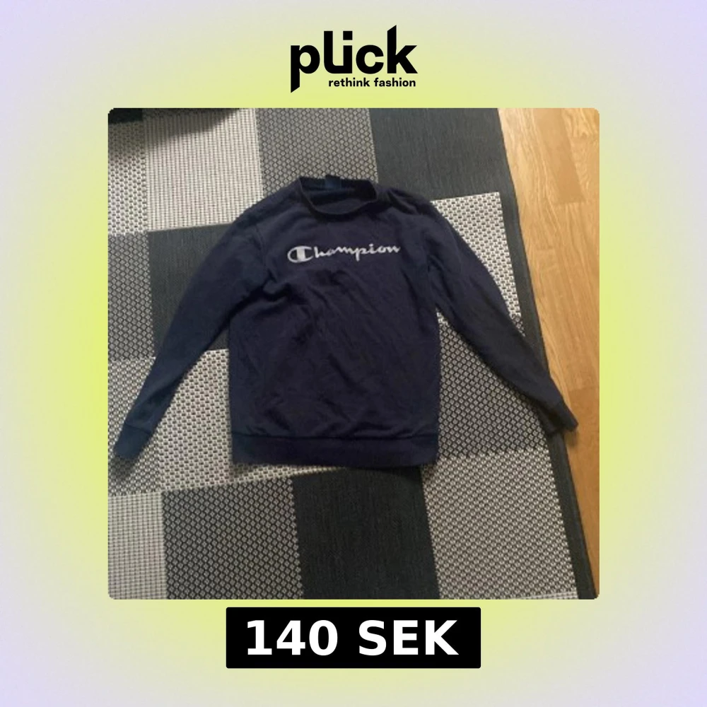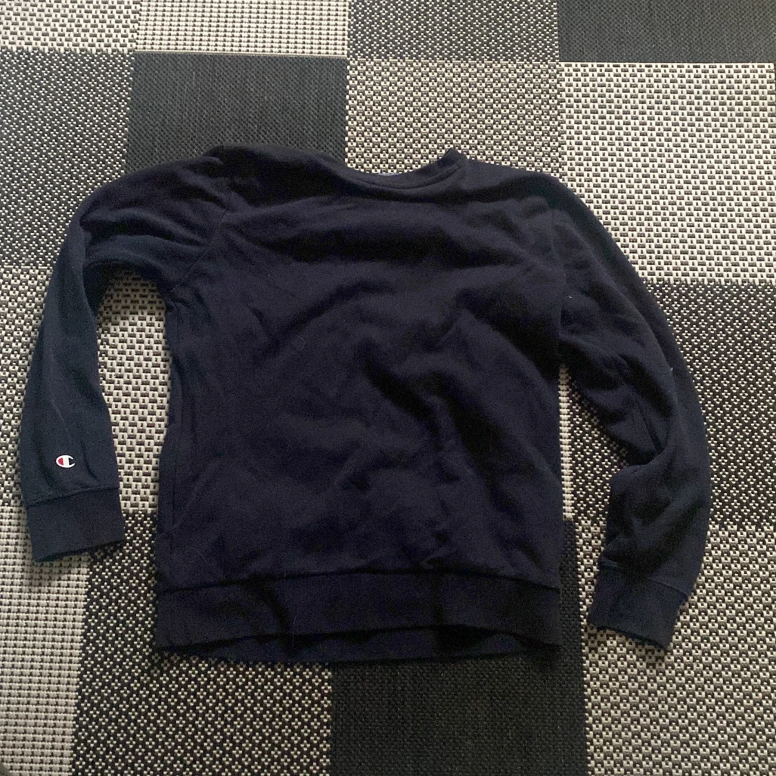 Säljer en mörkblå sweatshirt från Champion med deras ikoniska logga på bröstet. Tröjan har långa ärmar och en bekväm passform, perfekt för en avslappnad stil. Tillverkad i mjukt material för extra komfort. Det står att den är X-large men är lika stor som small