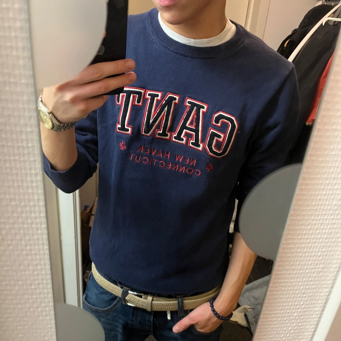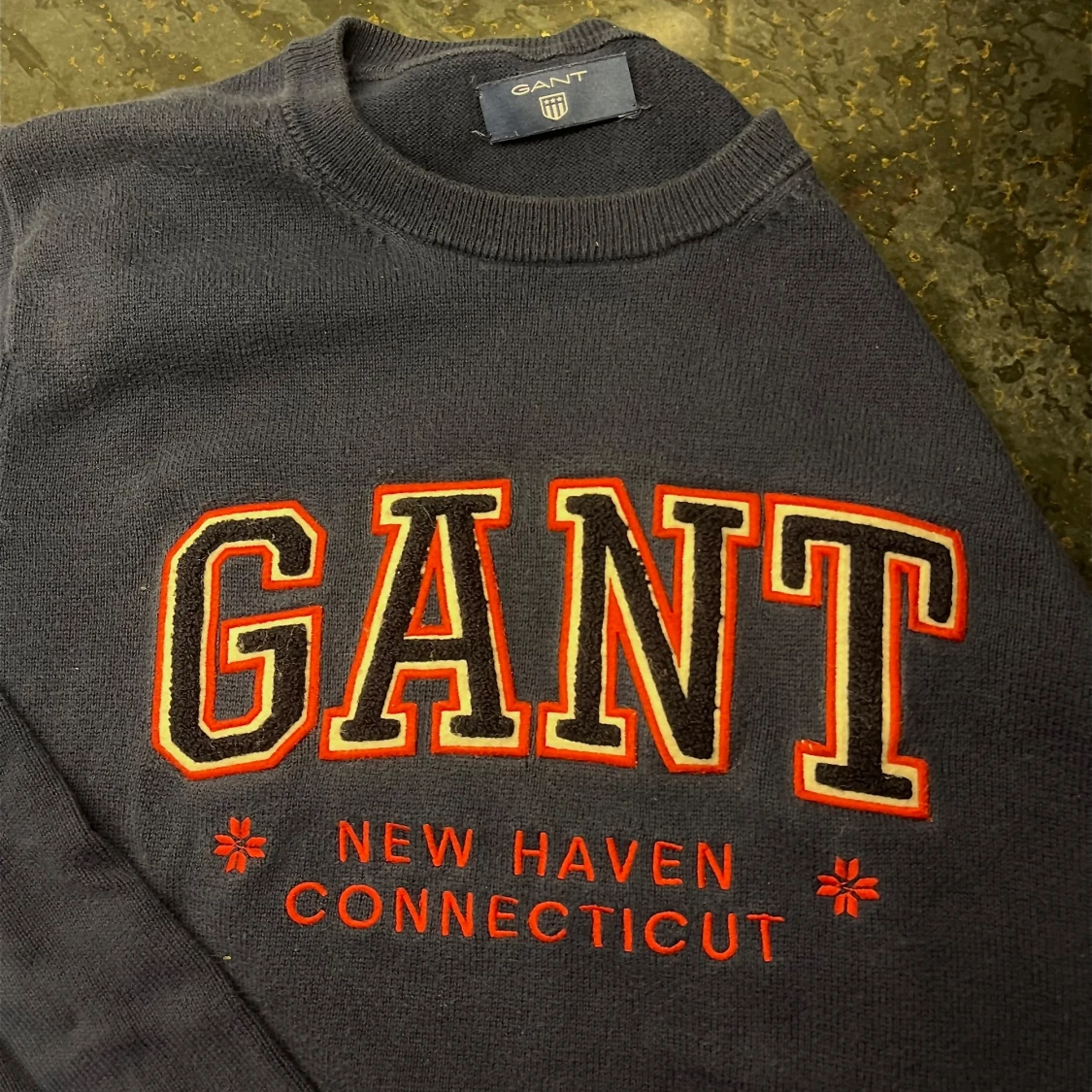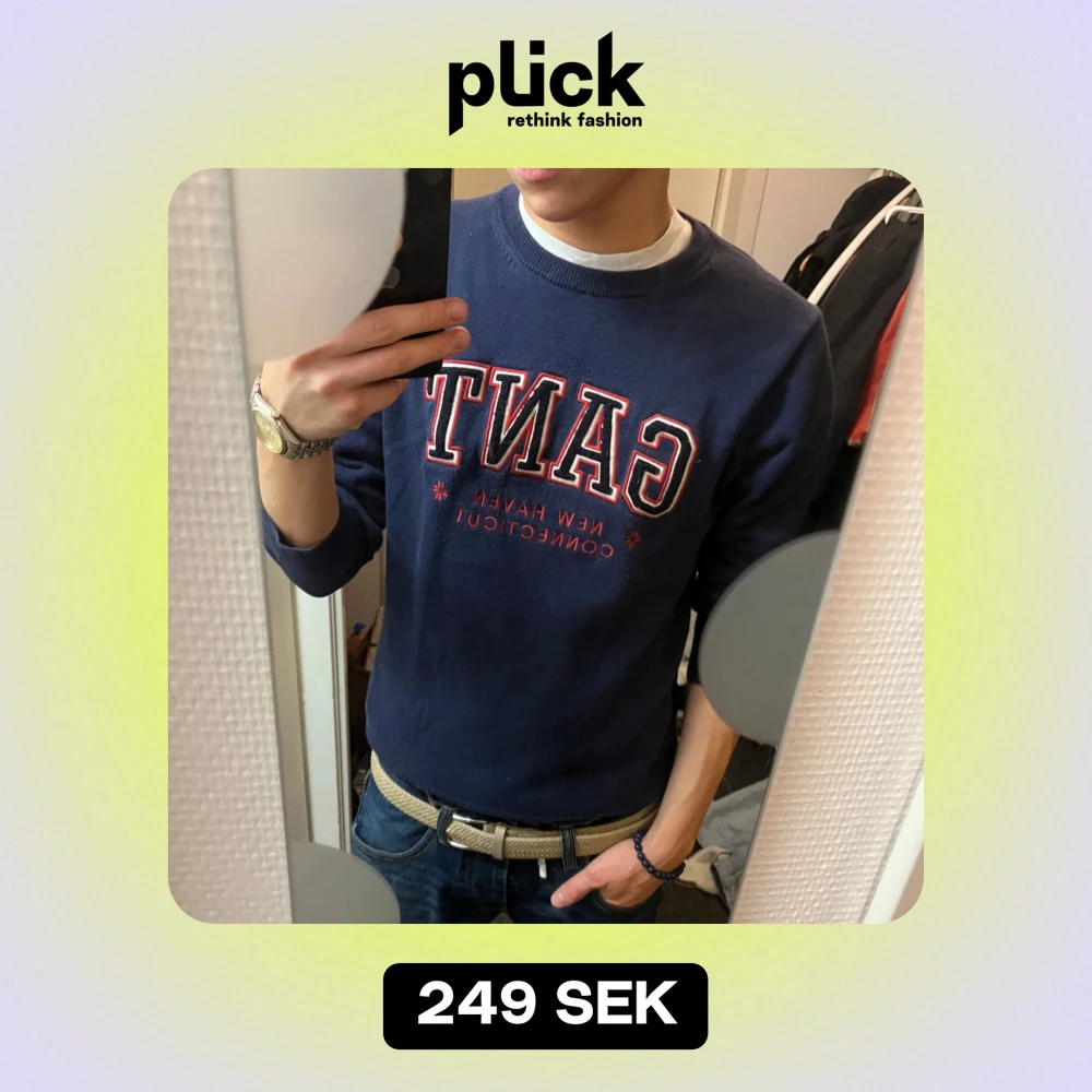 Säljer en snygg mörkblå sweatshirt från GANT med broderad logga i rött och vitt. Tröjan är i bra skick och perfekt för en casual look. Den har en klassisk rund hals och är superbekväm. Passar perfekt till jeans för en avslappnad stil.