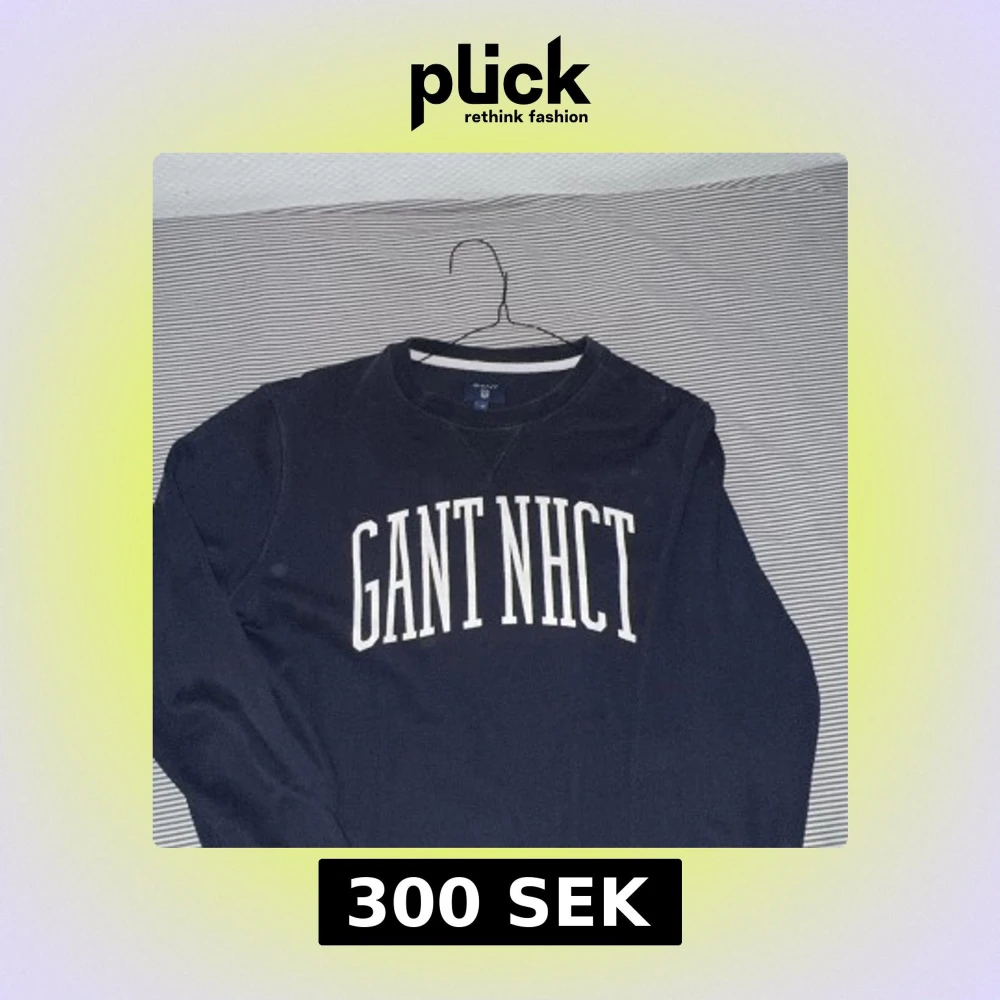 Säljer en mörkblå sweatshirt från GANT med vit text 'GANT NHCT' framtill. Tröjan har rund halsringning, långa ärmar och är tillverkad i mjuk bomull. Perfekt för en chill och stilren look.