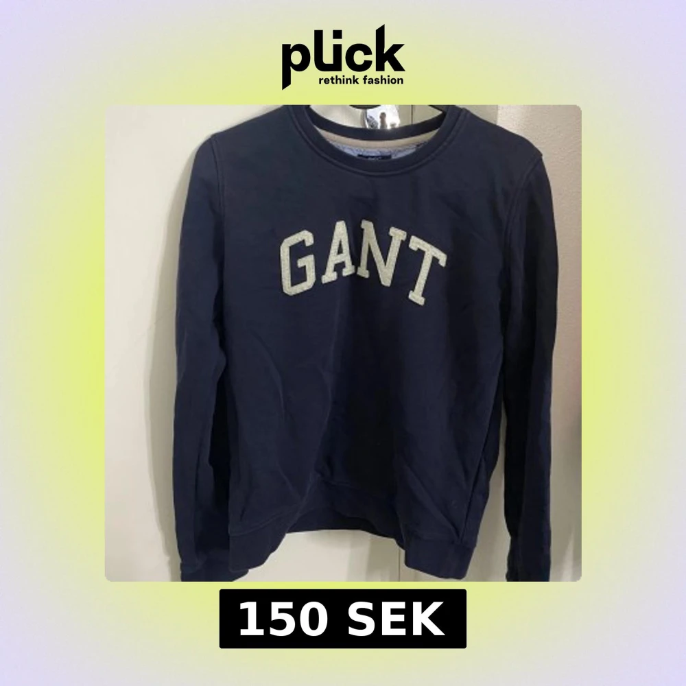 Säljer en mörkblå sweatshirt från GANT med klassisk rund hals och stora vita bokstäver framtill. Tröjan är i mjuk bomull och har långa ärmar. Perfekt för en chill och stilren look.