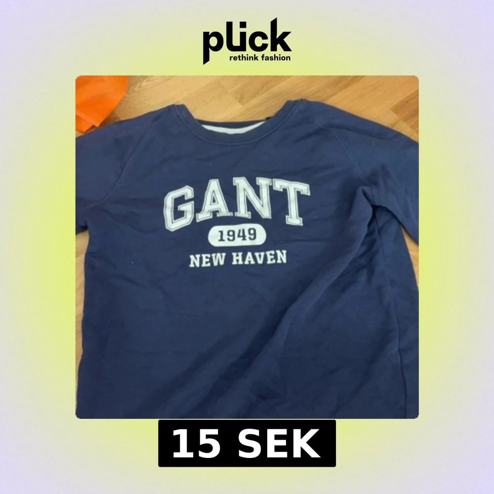 Säljer en mörkblå sweatshirt från GANT med vit text 'GANT 1949 NEW HAVEN' på bröstet. Tröjan har rund halsringning och långa ärmar. Tillverkad i mjuk bomull, perfekt för en chill och stilren look. Storlek XS