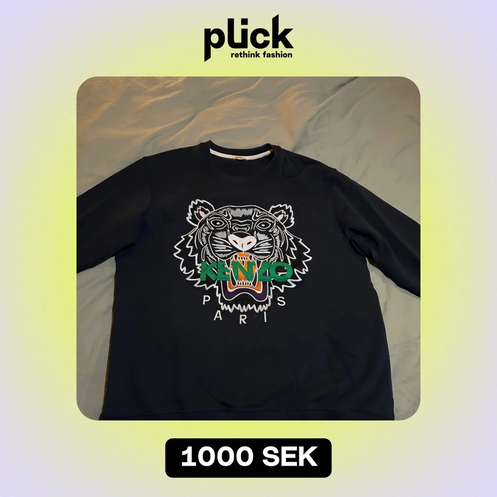 Säljer en svart sweatshirt från Kenzo med ett coolt tigerbroderi i vitt, grönt och orange på framsidan. Tröjan har långa ärmar och en rund halsringning. Perfekt för en avslappnad stil eller att sticka ut lite extra. Passar både till vardags och fest!