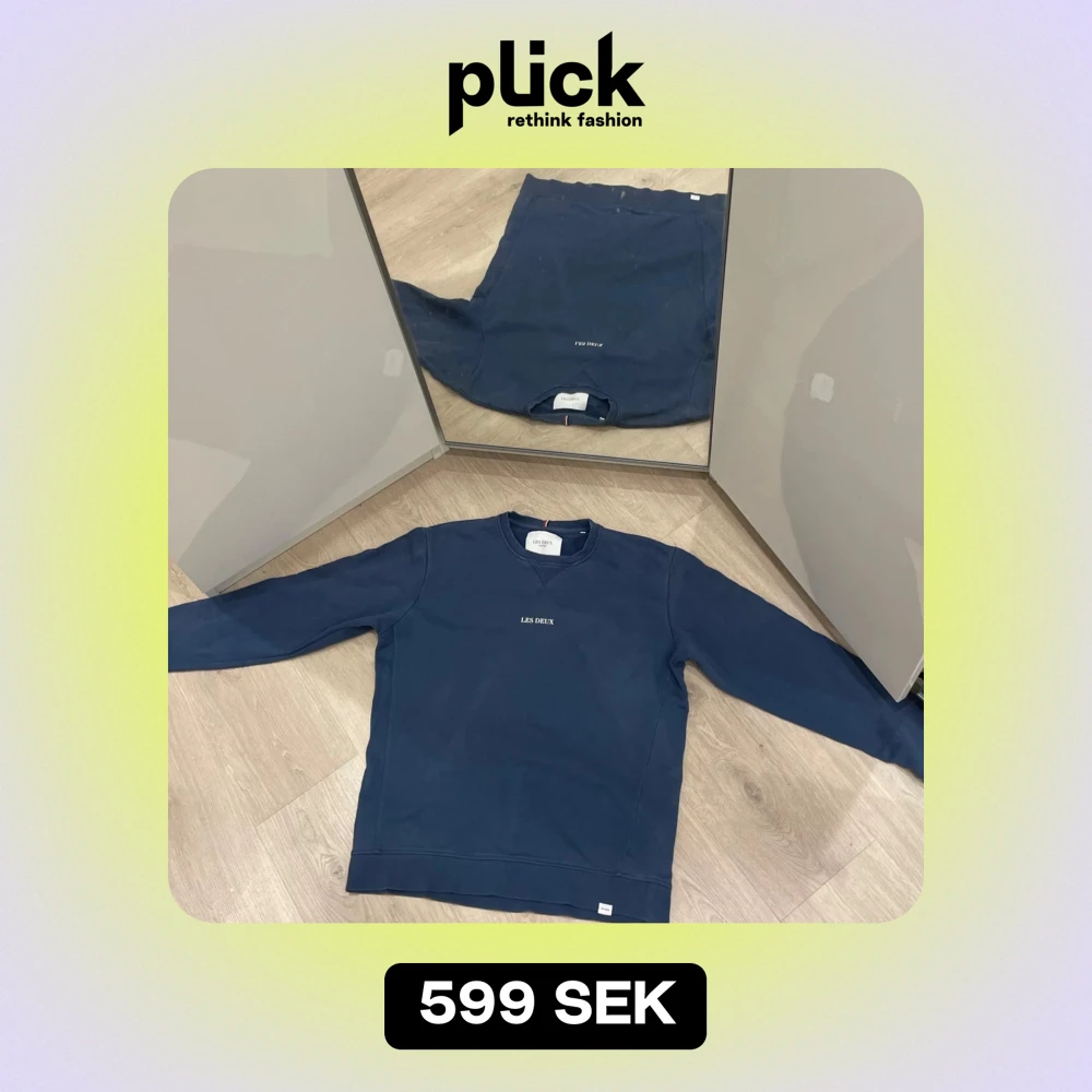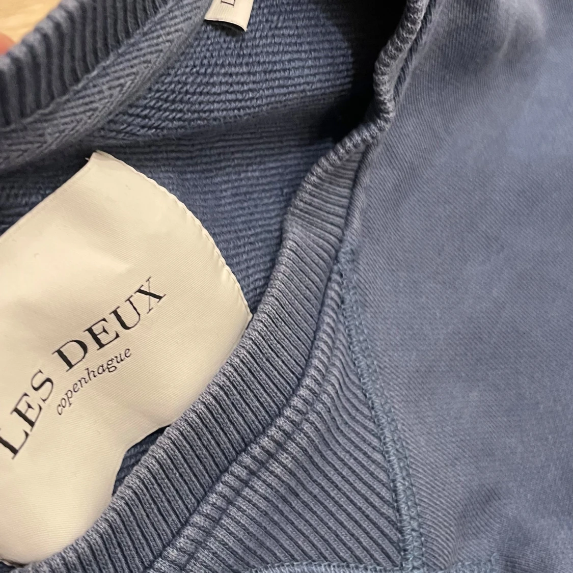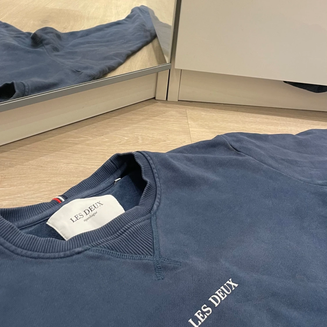 Säljer en snygg mörkblå sweatshirt från Les Deux. Den har en klassisk design med rund hals och ribbade muddar. Perfekt för både vardag och avslappnade tillfällen. Märket är broderat på bröstet för en stilren look.