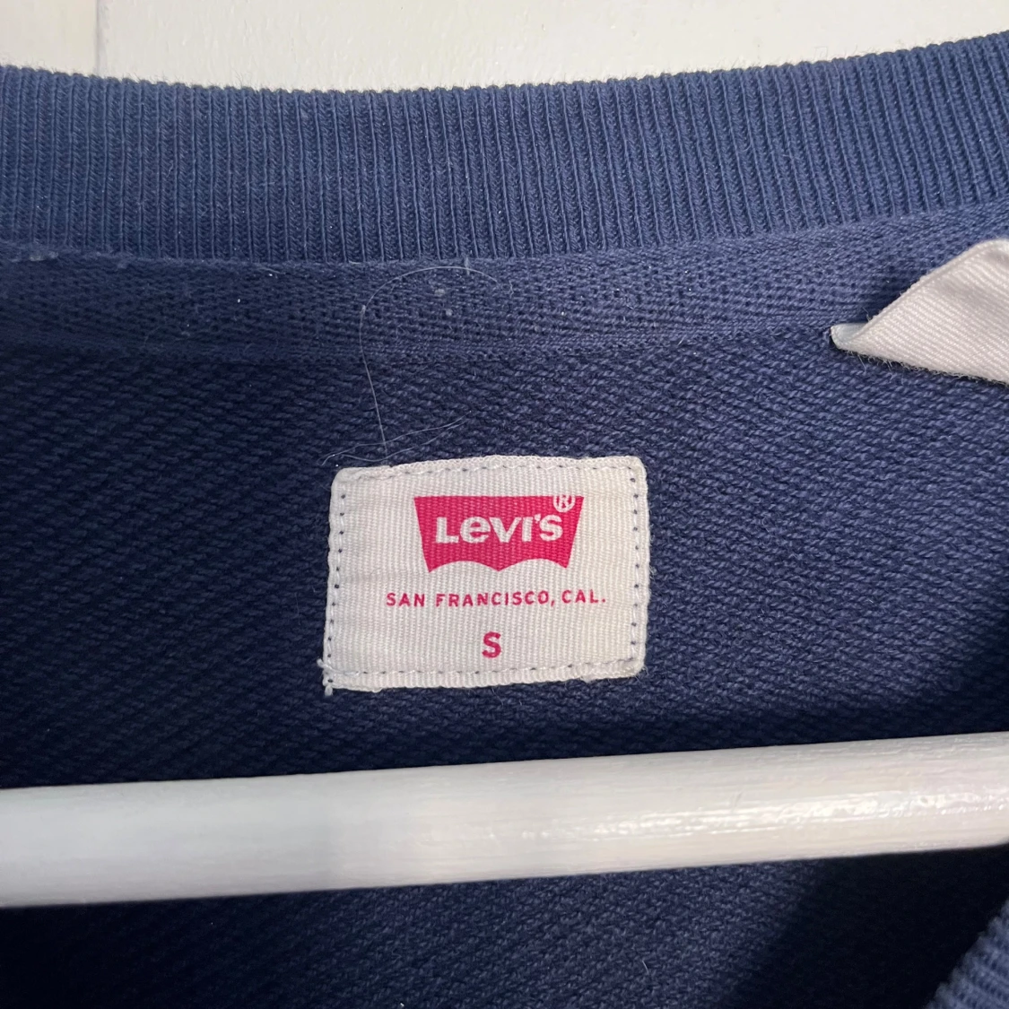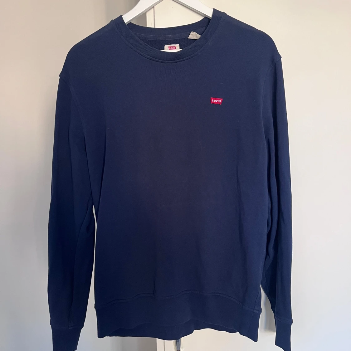 En stilren mörkblå sweatshirt från Levi's med klassisk rund hals och liten röd logotyp på bröstet. Tröjan har långa ärmar och är tillverkad i mjuk bomull, perfekt för en chill och enkel look.