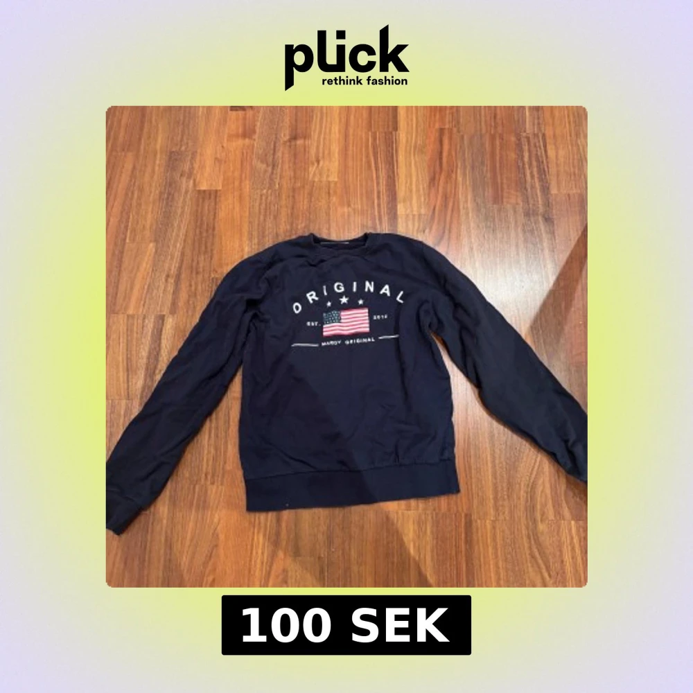 Säljer en snygg mörkblå sweatshirt från Marqy med tryck framtill. Tröjan har långa ärmar och en klassisk rund halsringning. Perfekt för en avslappnad stil.