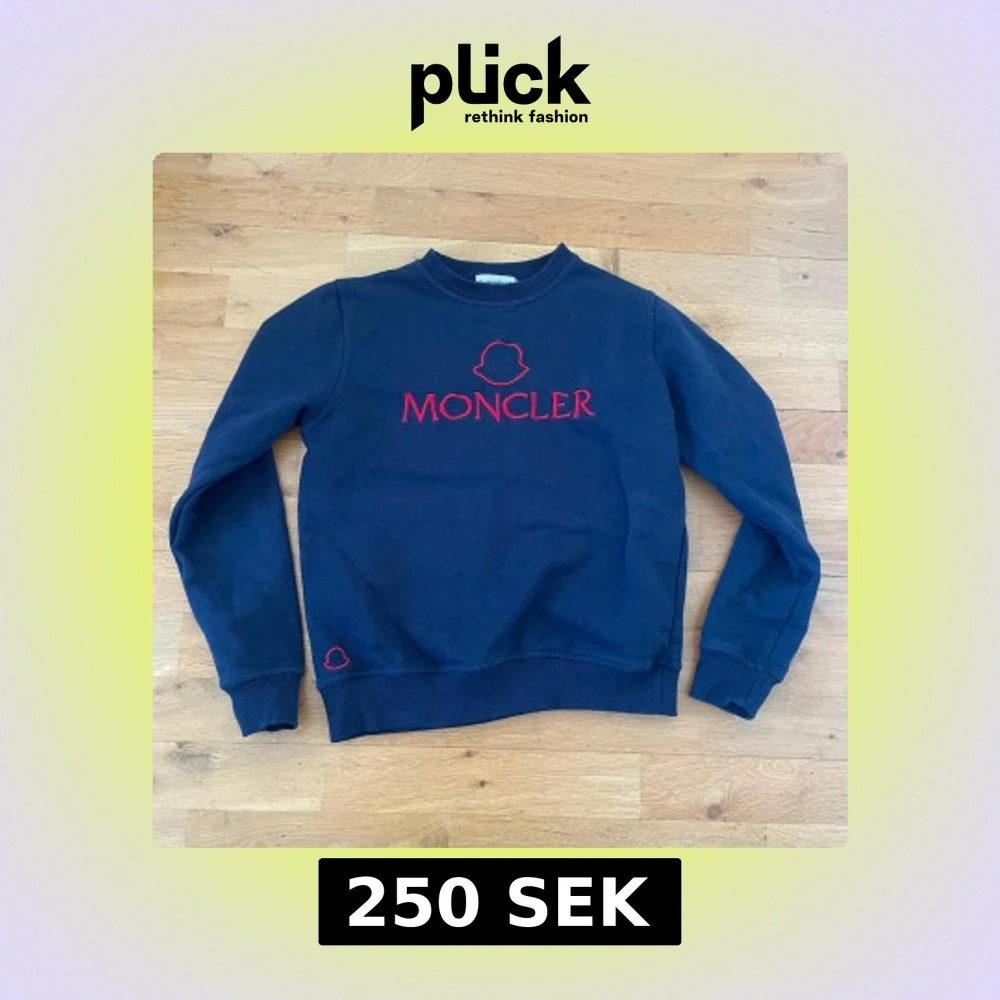 Säljer en snygg mörkblå sweatshirt från Moncler med röd broderad logga på framsidan. Tröjan har långa ärmar och ribbade muddar vid ärmslut och nederkant. Perfekt för en stilren look!