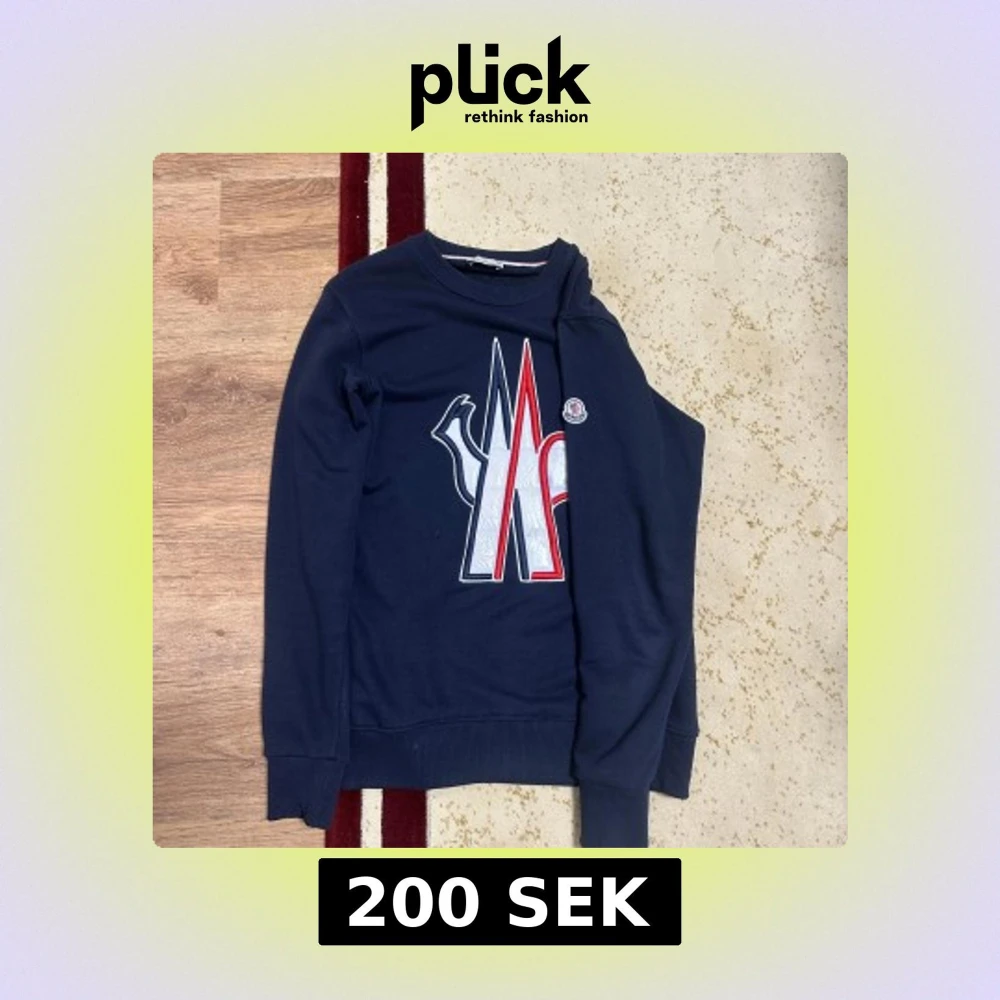 Säljer en mörkblå sweatshirt från Moncler med stort broderat logomärke i vitt, rött och blått framtill. Tröjan har rund hals, långa ärmar och ribbade muddar. Klassisk och stilren design med Moncler-logga även på ärmen.