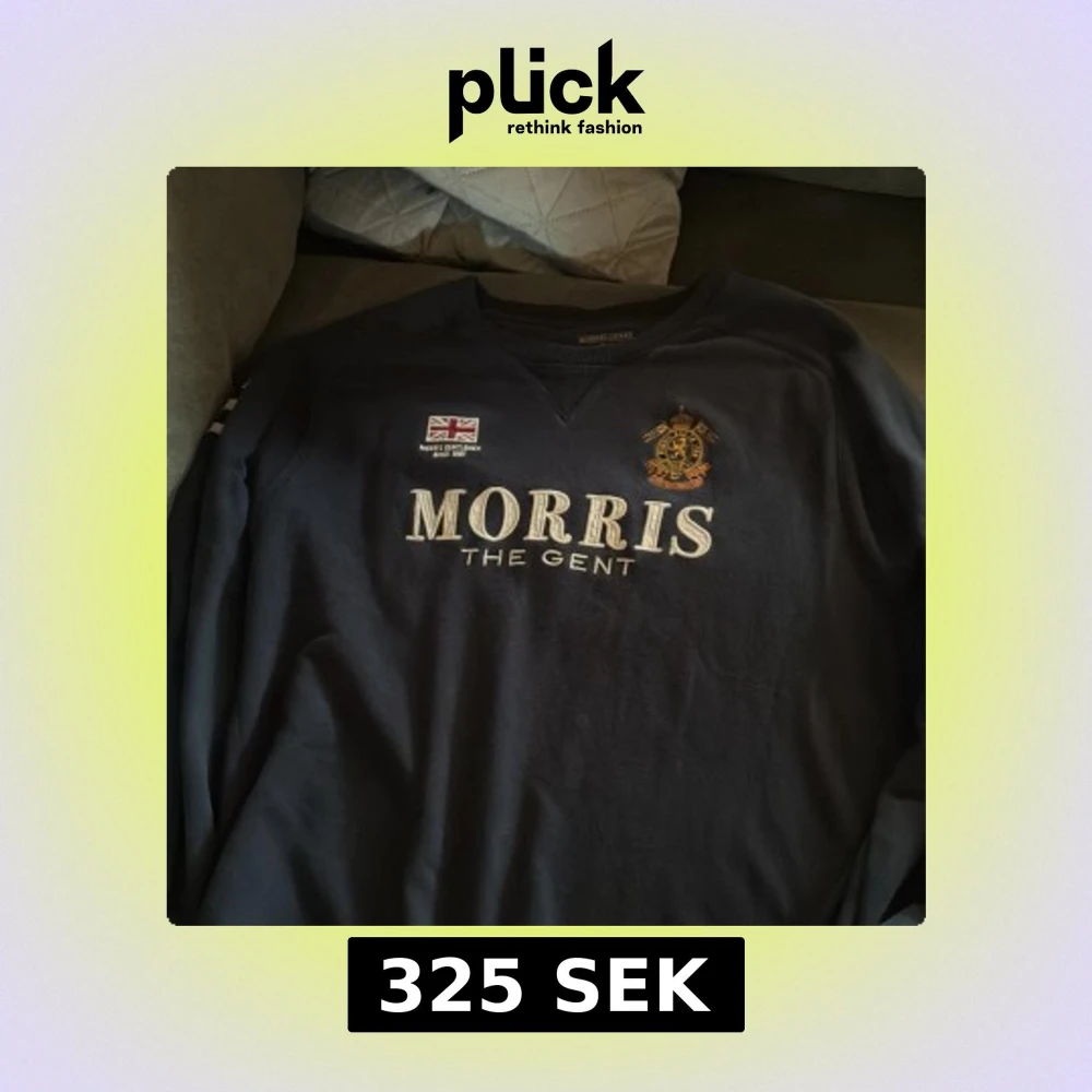 Mörkblå sweatshirt från Morris Gents i storlek XL. Tröjan har broderad logga, brittisk flagga och siffran 68 på ärmen. Klassisk rund halsringning och ribbade muddar. Snyggt tryck med 'MORRIS THE GENT' framtill.