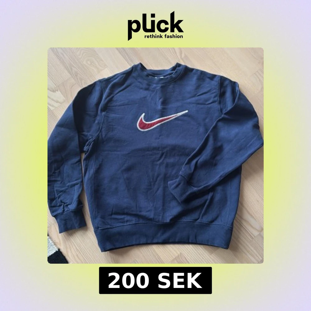 Säljer en mörkblå sweatshirt från Nike med det ikoniska röda swoosh-logotypen på bröstet. Tröjan har långa ärmar och ribbade muddar vid ärmslut och nederkant. Perfekt för en avslappnad stil.