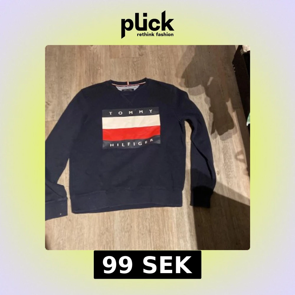Säljer en mörkblå sweatshirt från Tommy Hilfiger med klassisk logga i vitt, rött och blått framtill. Tröjan har rund hals, långa ärmar och ribbade muddar. Perfekt för dig som gillar stilrena och ikoniska plagg.