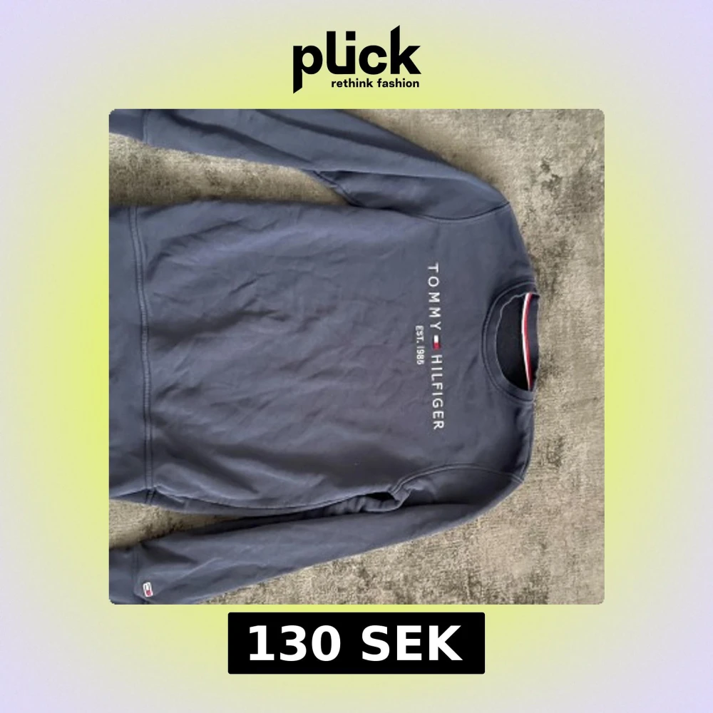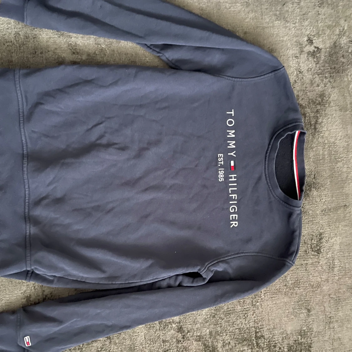 Säljer en mörkblå sweatshirt från Tommy Hilfiger med tryckt logga och texten 'EST. 1985' på bröstet. Tröjan har rund halsringning och långa ärmar. Klassisk och stilren design med små Hilfiger-detaljer vid ärmslut.