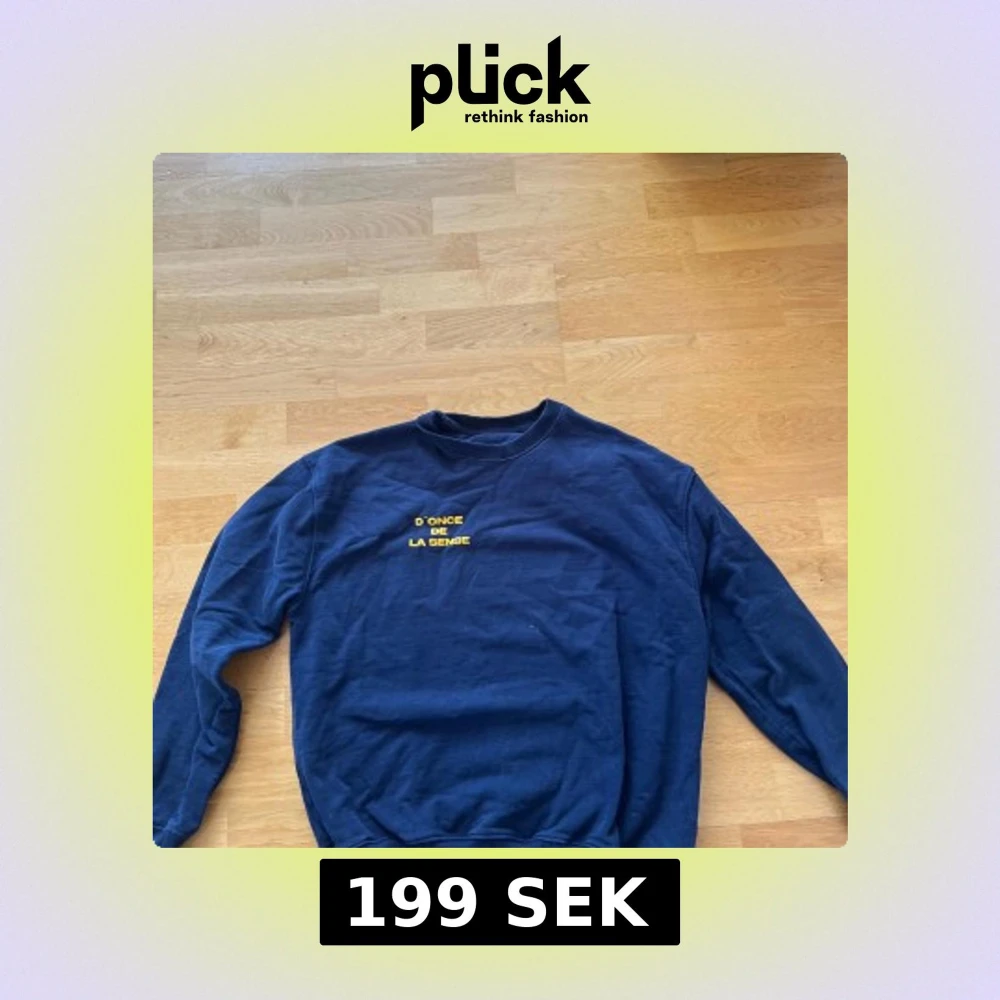 Säljer en mörkblå sweatshirt med trycket 'D'ONCE DE LA SENSE' i gul text på bröstet. Tröjan har rund halsringning och långa ärmar. Perfekt för en avslappnad stil.