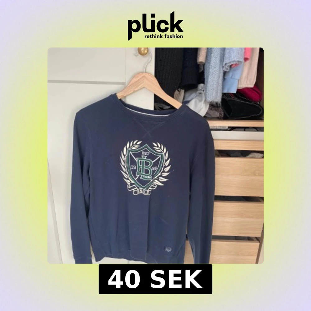 Mörkblå sweatshirt från Bondelid med stort tryck framtill i grönt och vitt. Klassisk rund halsringning och långa ärmar. Perfekt för dig som gillar en preppy stil med collegekänsla.