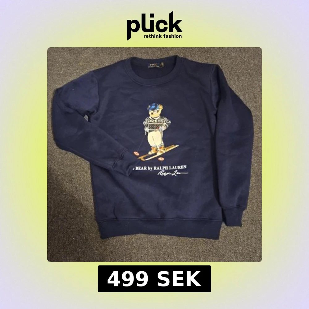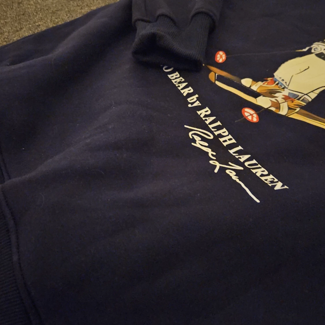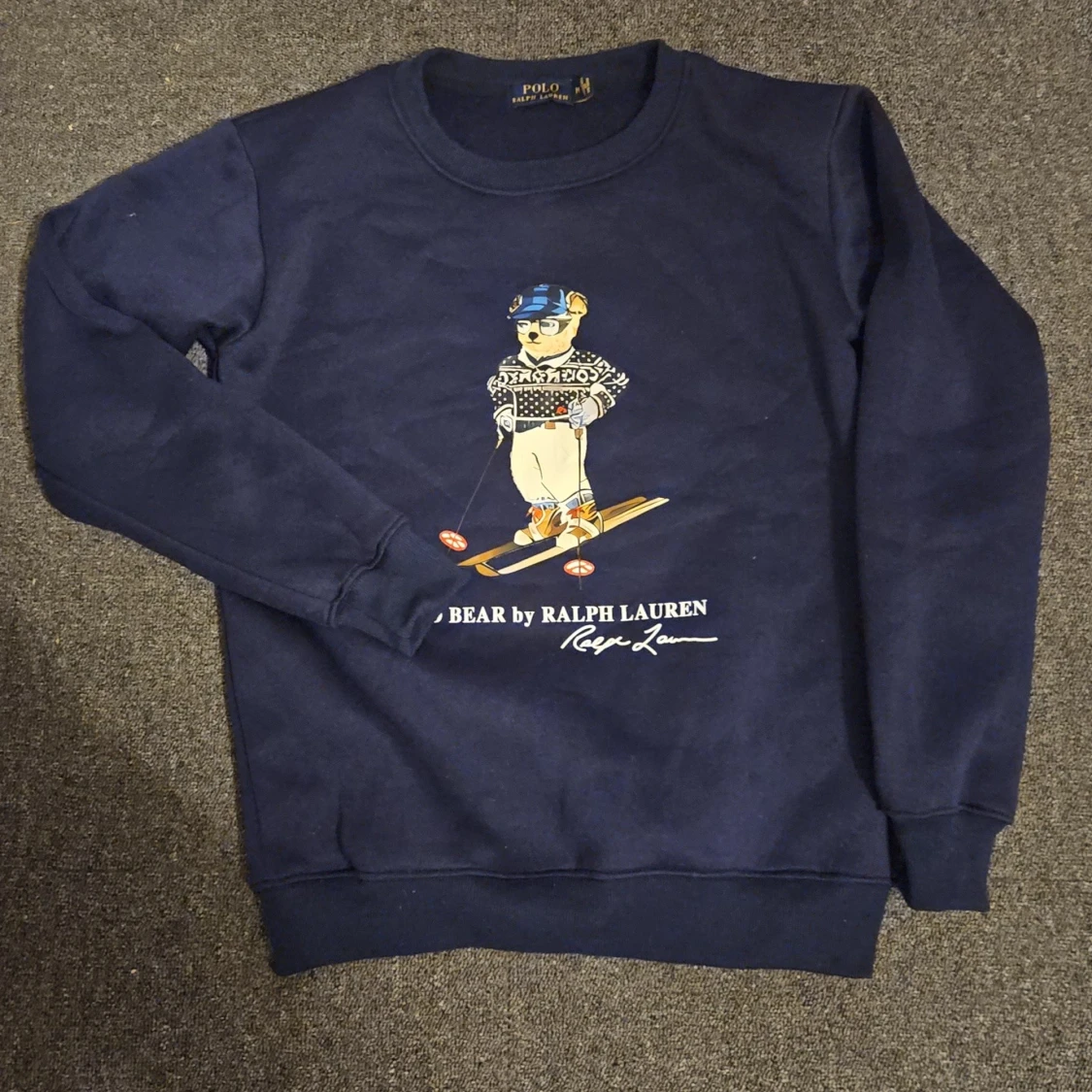 Mörkblå sweatshirt från Polo Ralph Lauren med ikoniska Polo Bear-trycket på bröstet där björnen åker skidor. Tröjan har rund hals, långa ärmar och ribbade muddar. Perfekt för dig som gillar sportiga och snygga plagg med en twist.