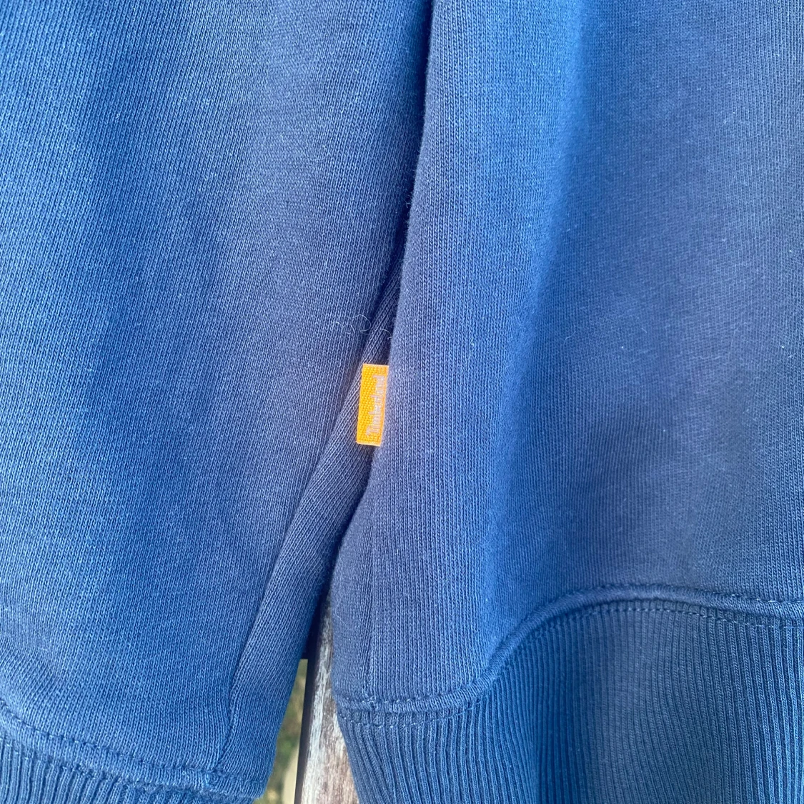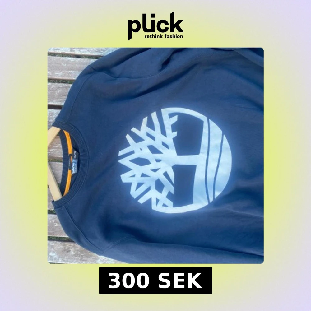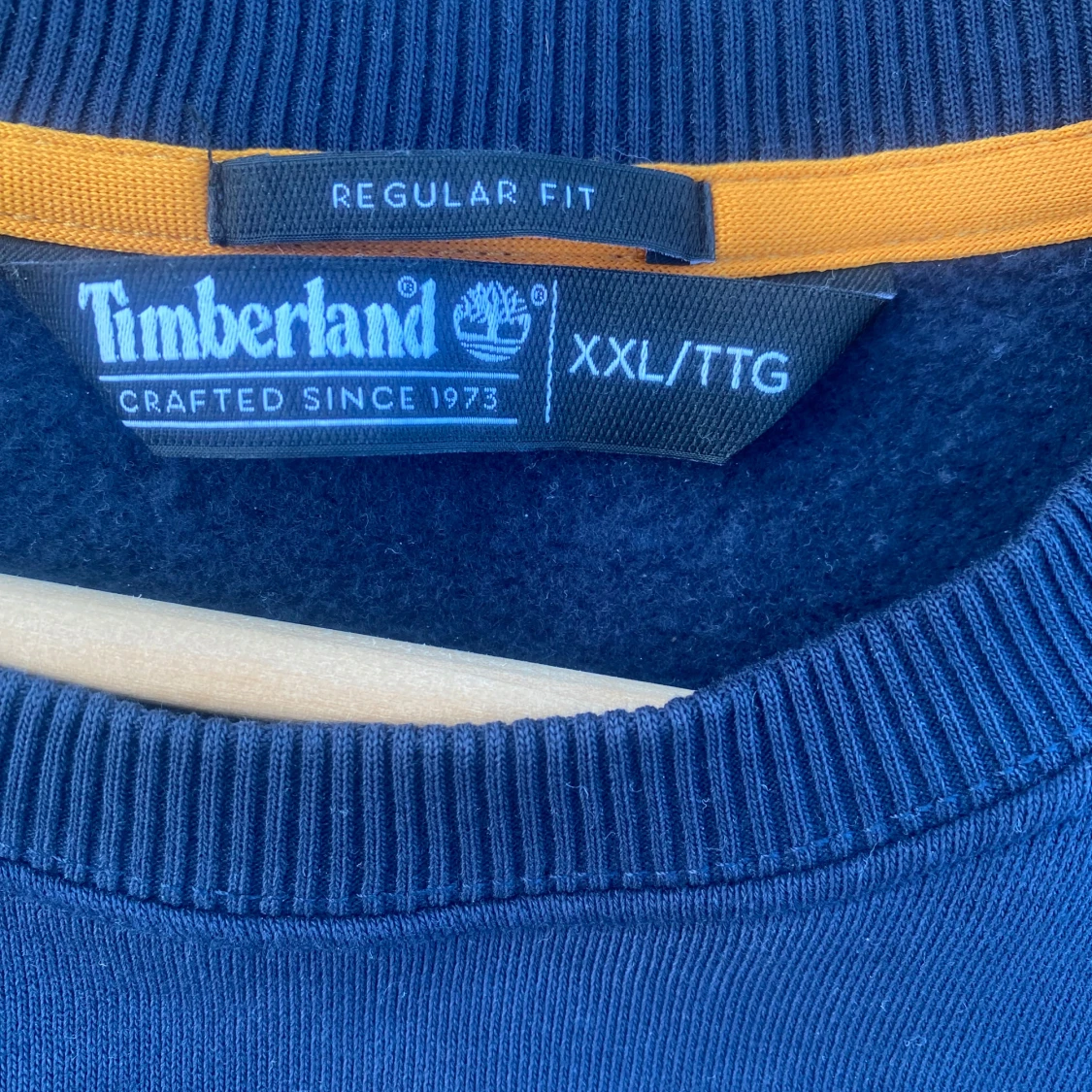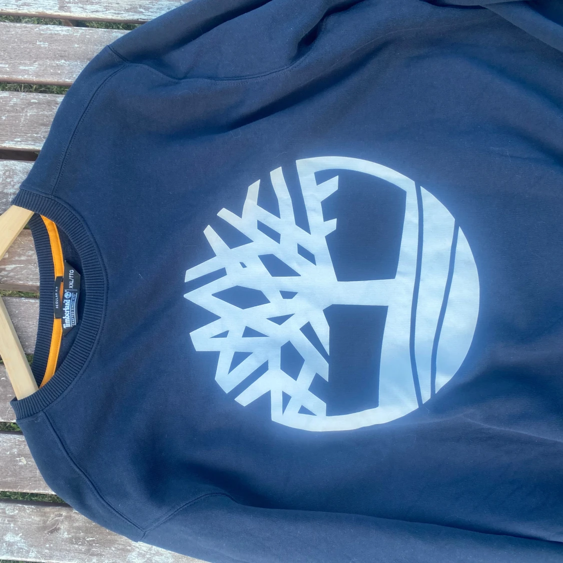 Säljer en mörkblå sweatshirt från Timberland i storlek XXL med stort vitt Timberland-tryck på bröstet. Tröjan har rund hals, ribbade muddar och en orange detalj på insidan av kragen. Regular fit och tillverkad i mjuk bomull.