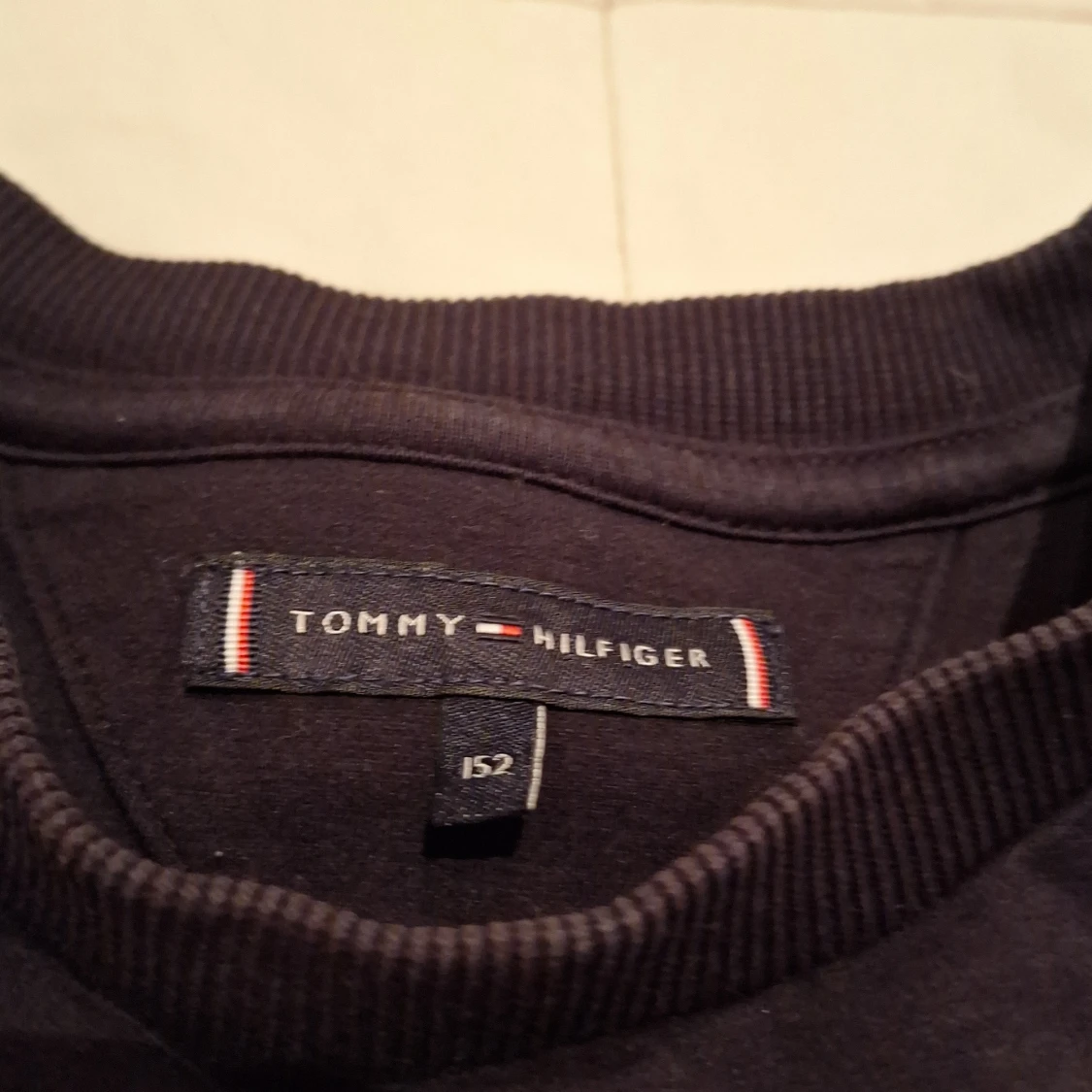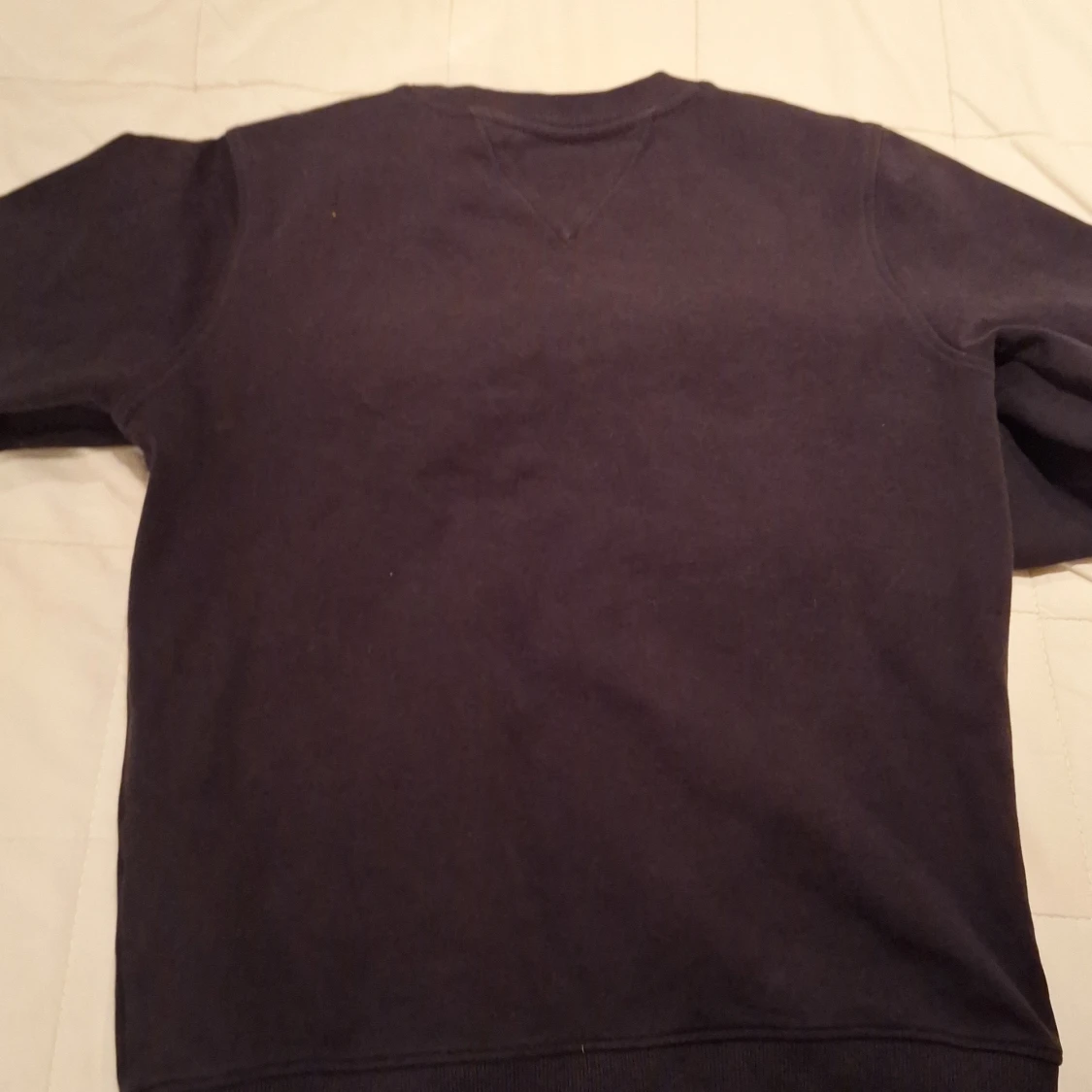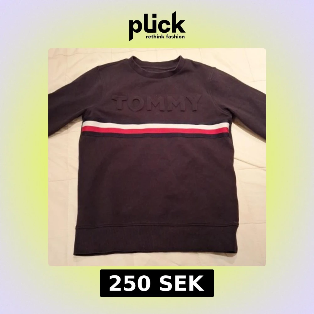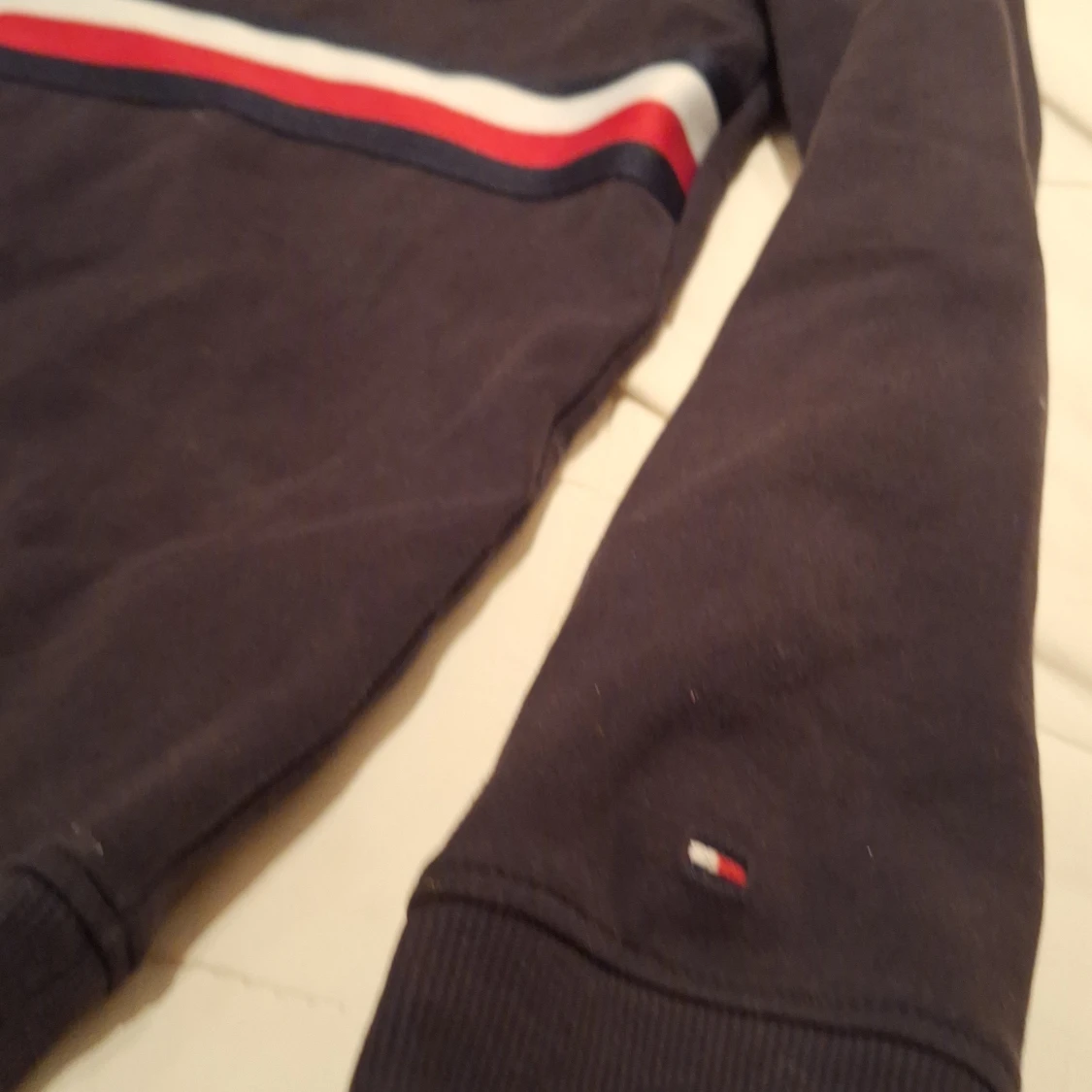Snygg mörkblå sweatshirt från Tommy Hilfiger med upphöjd TOMMY-text på bröstet och klassiska ränder i vitt, rött och blått över bröstet. Långärmad modell med ribbade muddar och liten logga på ärmen. Perfekt för en chill och stilren look.