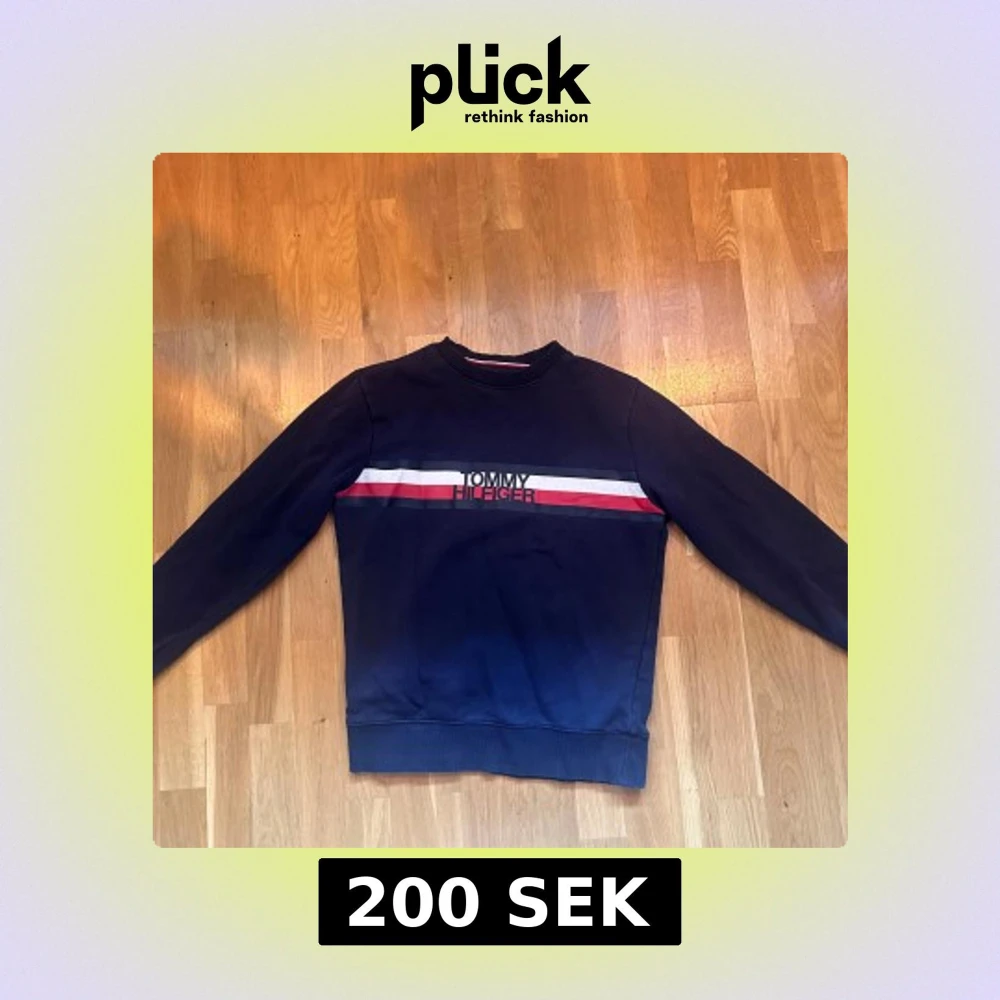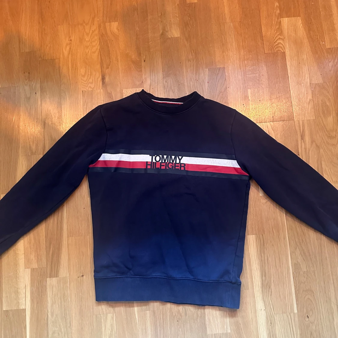 Säljer en mörkblå sweatshirt från Tommy Hilfiger med klassisk logga och ränder i vitt och rött över bröstet.