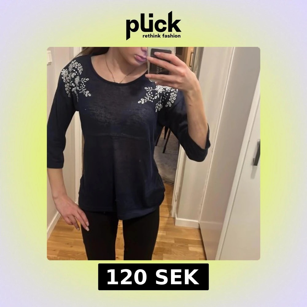 Säljer en mörkblå topp med vita broderade blommor på axlarna. Tröjan har trekvartsärm och rund halsringning. Tunt och lätt material som känns skönt mot huden. Perfekt för dig som vill ha något enkelt men ändå med fina detaljer.