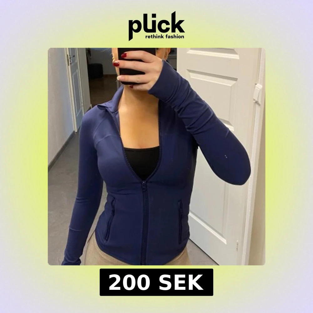 Snygg mörkblå träningskofta med dragkedja och hål till tummen. Finns även en ficka vid armen där man kan ha airpods eller nycklar medans man tränar. Sitter som en smäck och bra material. Oanvänd och prislapp kvar