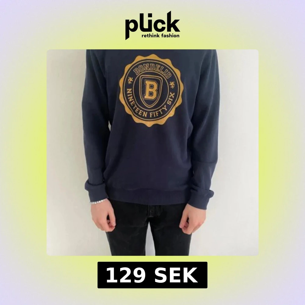 Säljer en snygg mörkblå tröja från Bondelid med ett stort tryck på framsidan. Passform S-M. Modellen på bilden är cirka 180 och väger cirka 70 kg.