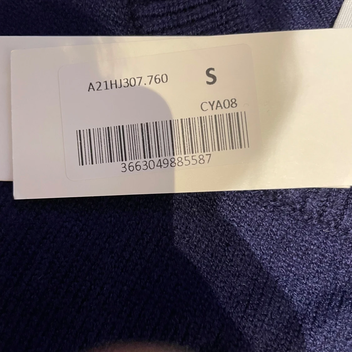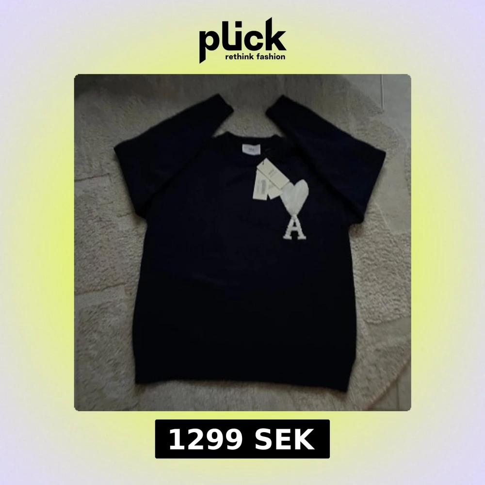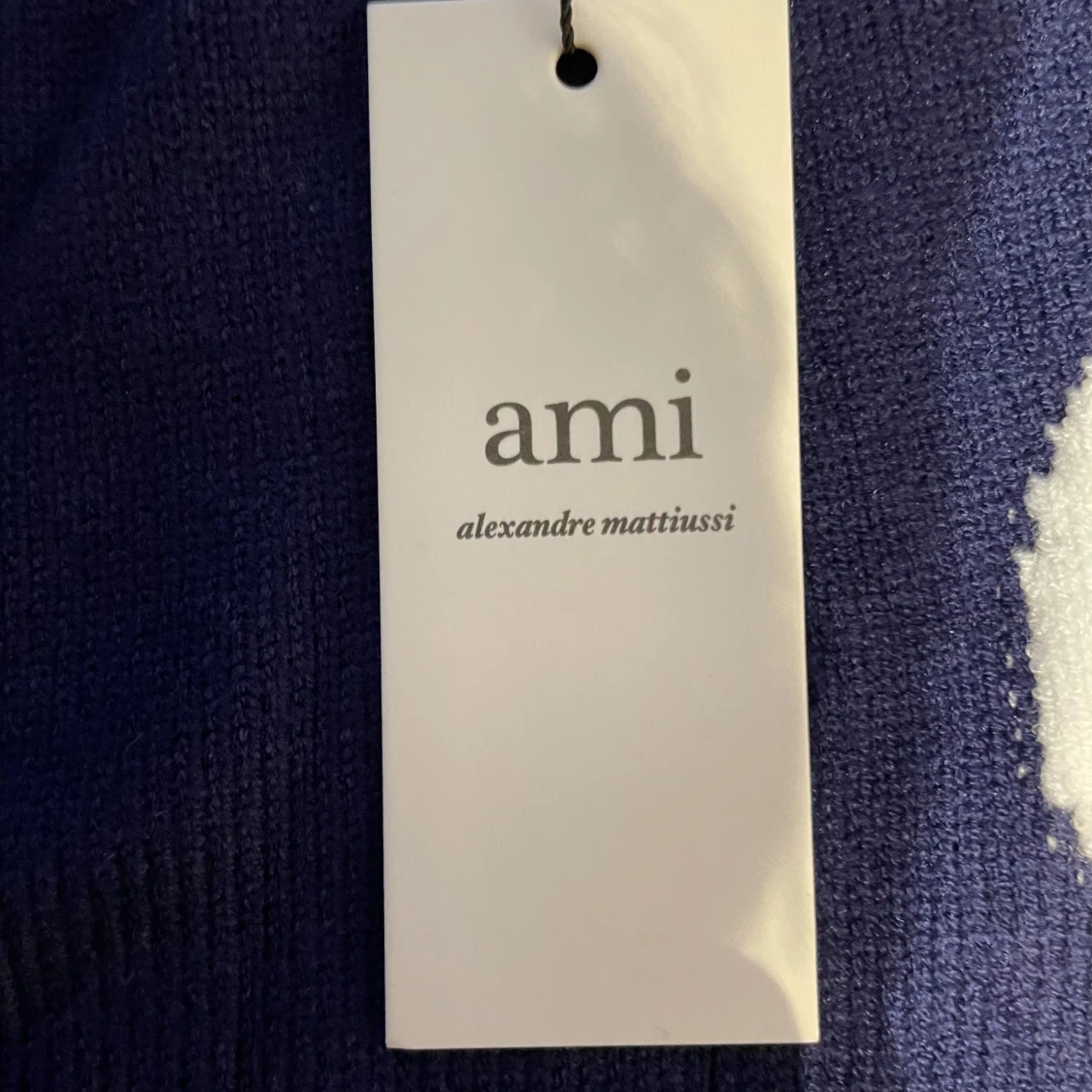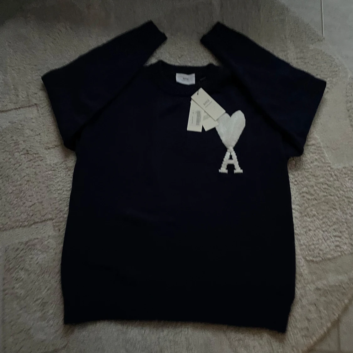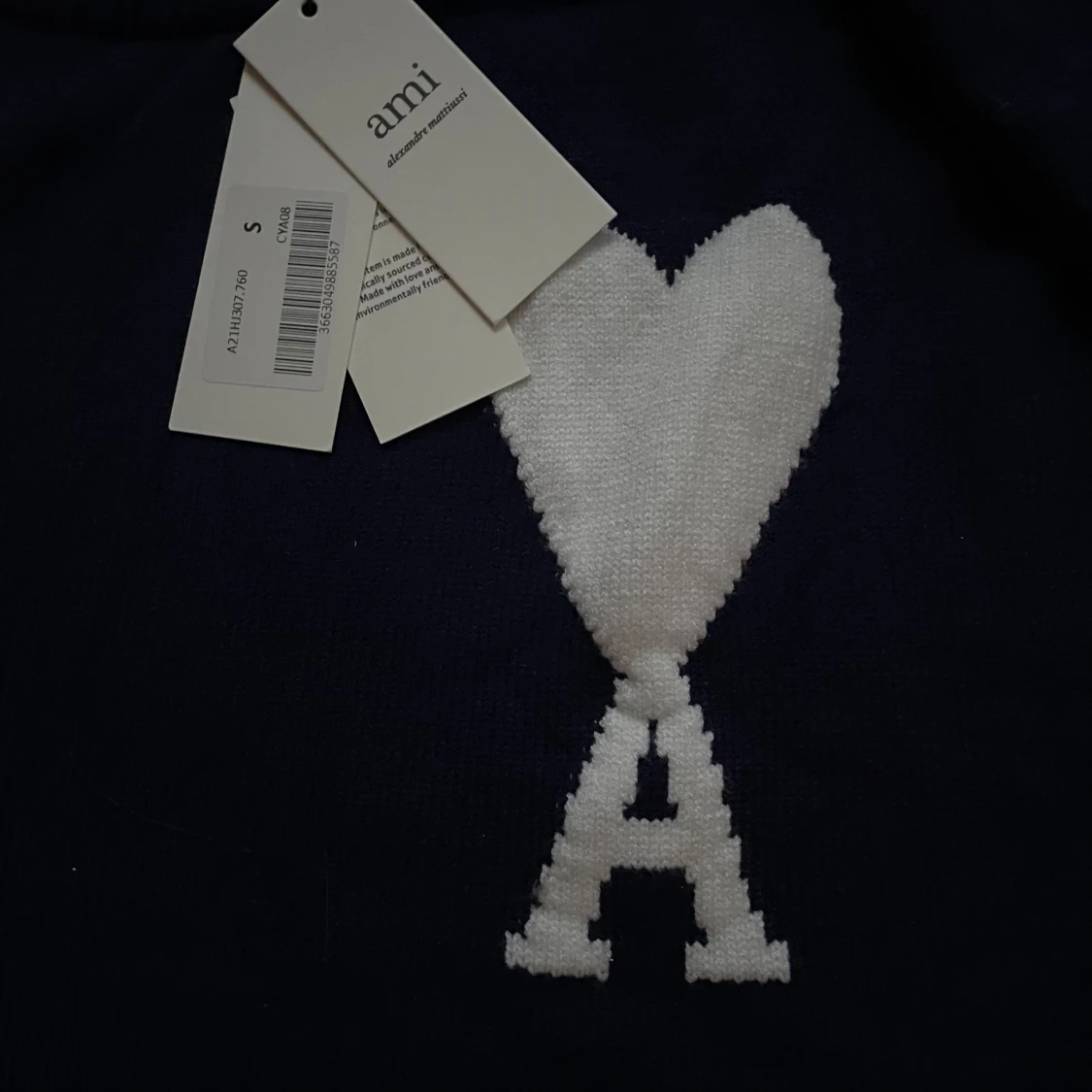 Säljer en stilren mörkblå tröja från Ami med ett vitt hjärta och bokstaven A på bröstet. Tröjan har långa ärmar och en klassisk passform. Perfekt för en trendig look.