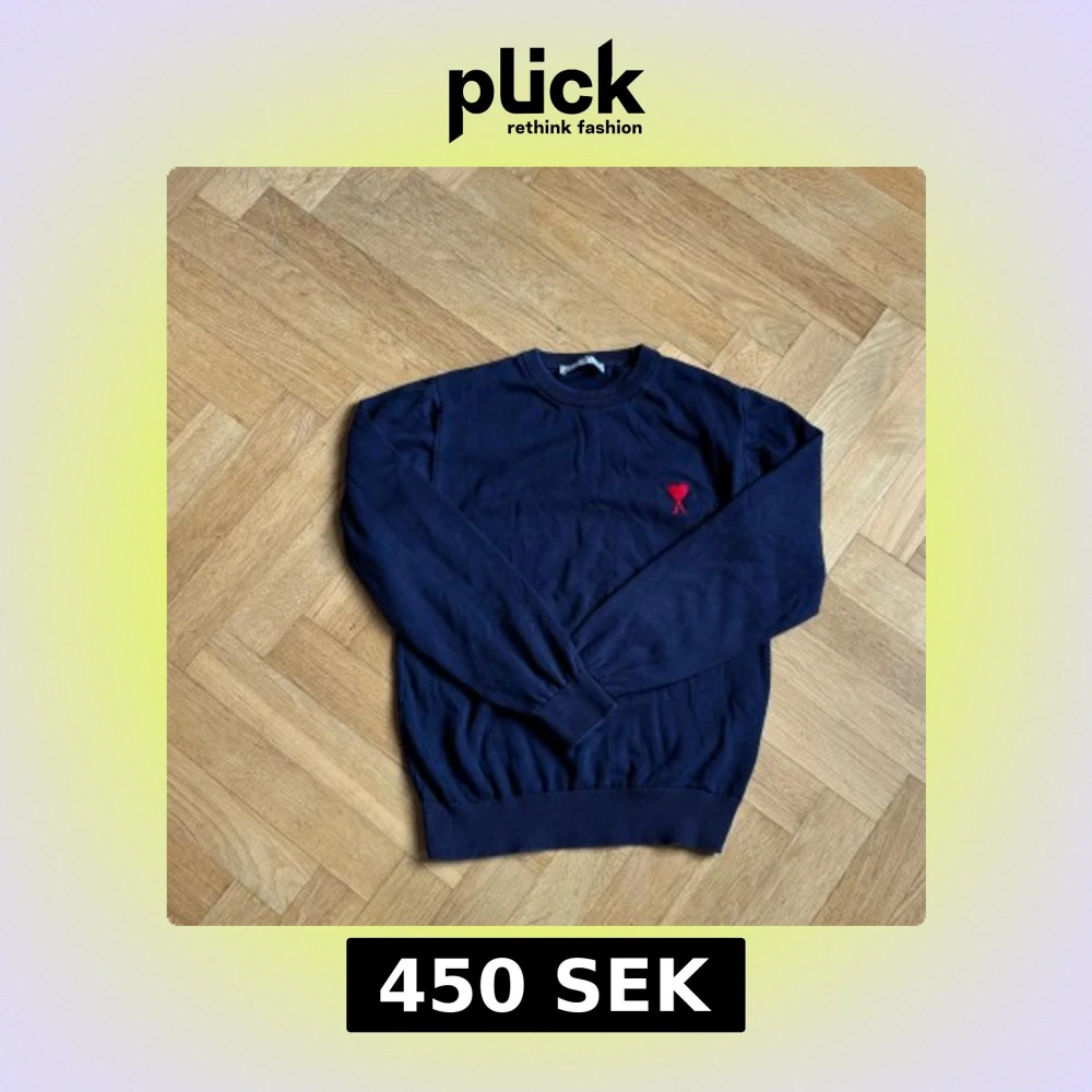 Mörkblå långärmad tröja från Ami Alexandre Mattiussi med rund hals och röd broderad hjärtlogga på bröstet. Tröjan är ribbad vid ärmslut och nederkant och har en clean, klassisk look som funkar till allt.