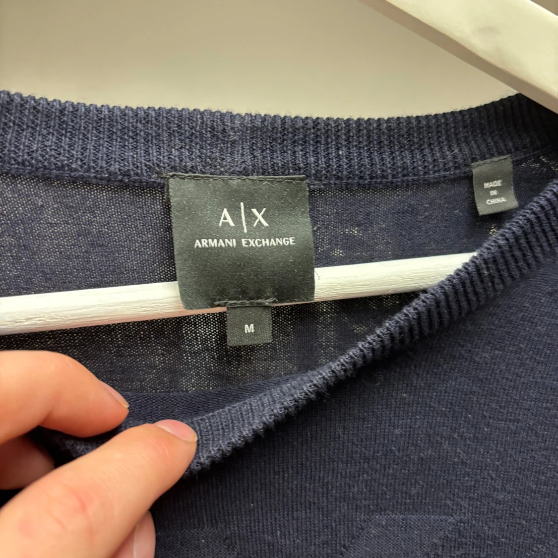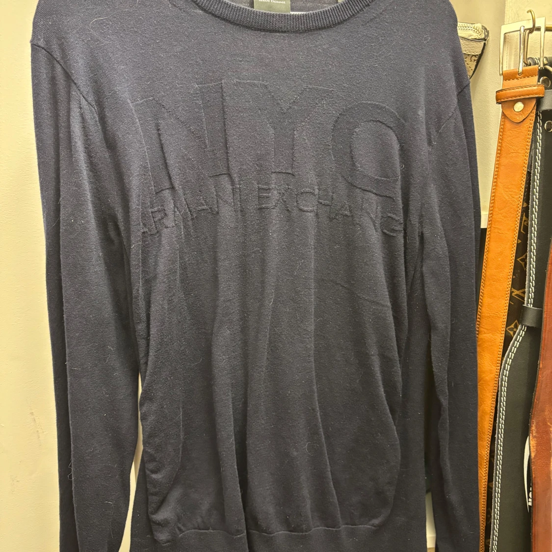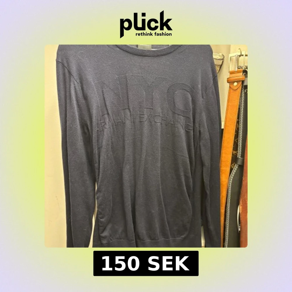 Säljer en stilren mörkblå tröja från Armani Exchange med texten 'NYC' diskret präglad på framsidan. Tröjan har långa ärmar och en rund halsringning. Perfekt för en avslappnad men ändå snygg look.
