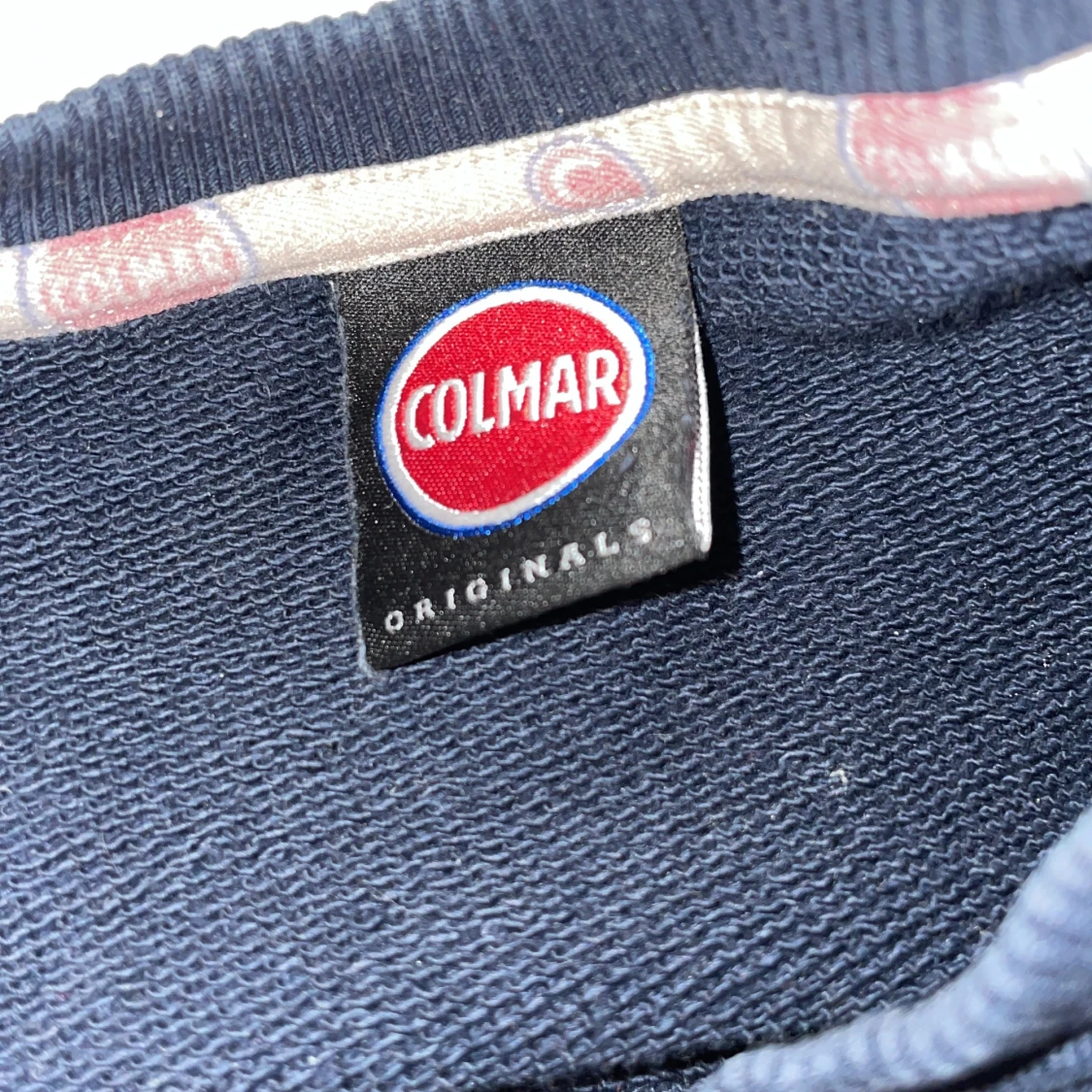 Säljer en snygg mörkblå tröja från Colmar med deras ikoniska logga på bröstet. Tröjan har långa ärmar och en rund halsringning. Perfekt för en avslappnad stil.