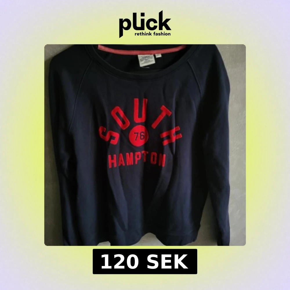 Säljer en mörkblå tröja från Crocker med röd text 'South Hampton 76' på framsidan. Tröjan har långa ärmar och en rund halsringning. Perfekt för en avslappnad stil.