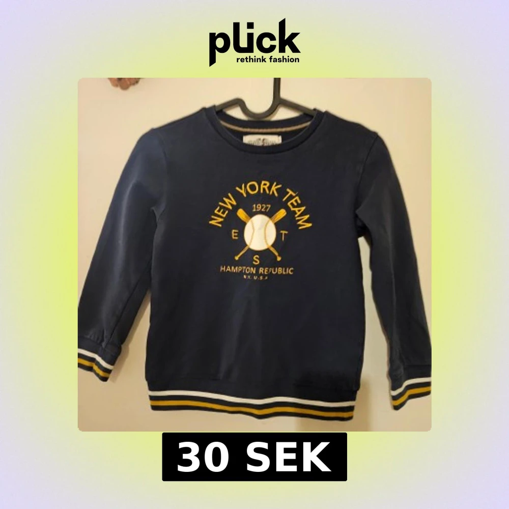 Säljer en mörkblå tröja från Hampton Republic med tryck 'New York Team' och två korsade basebollträn. Tröjan har långa ärmar och ribbade muddar med gula och vita ränder vid ärmslut och nederkant. Perfekt för en sportig look!